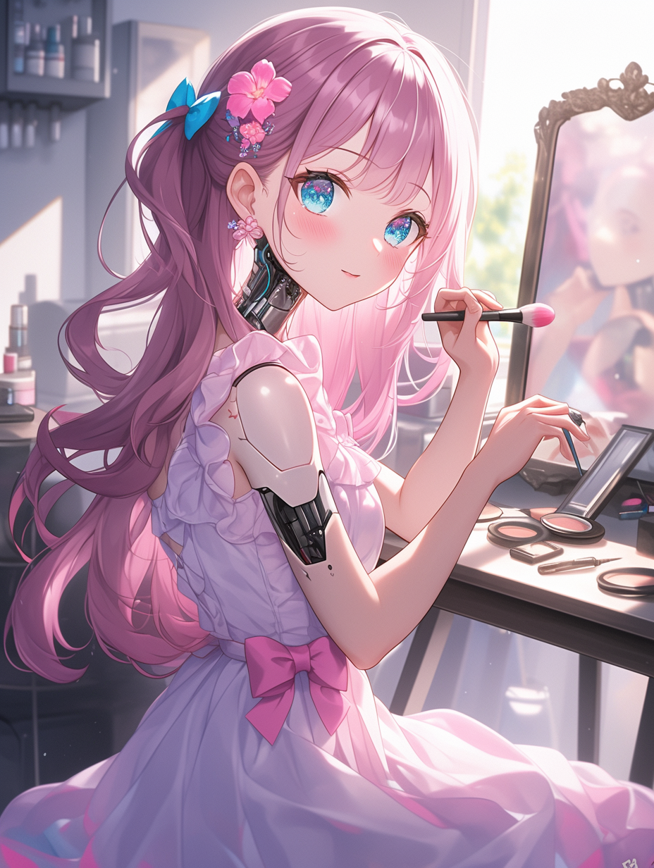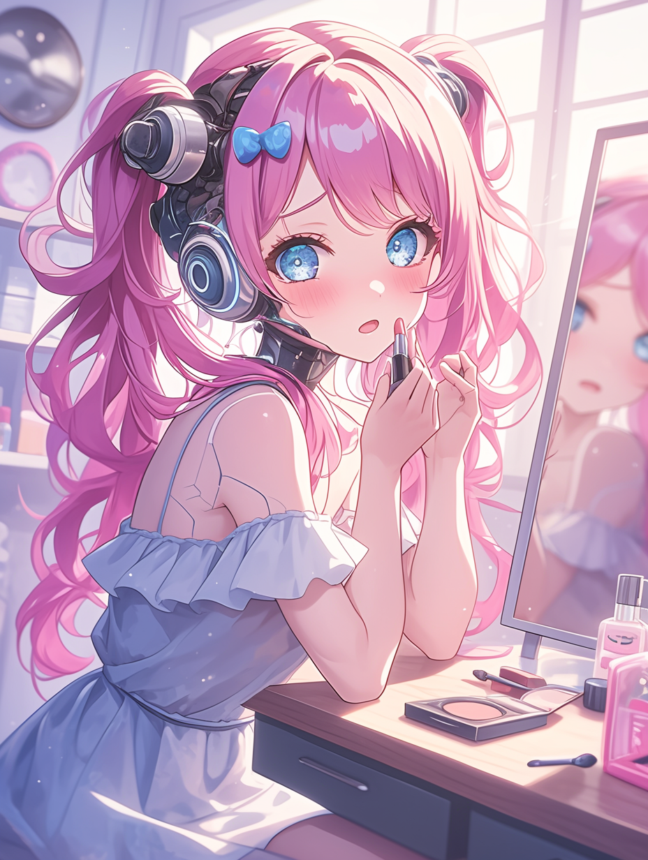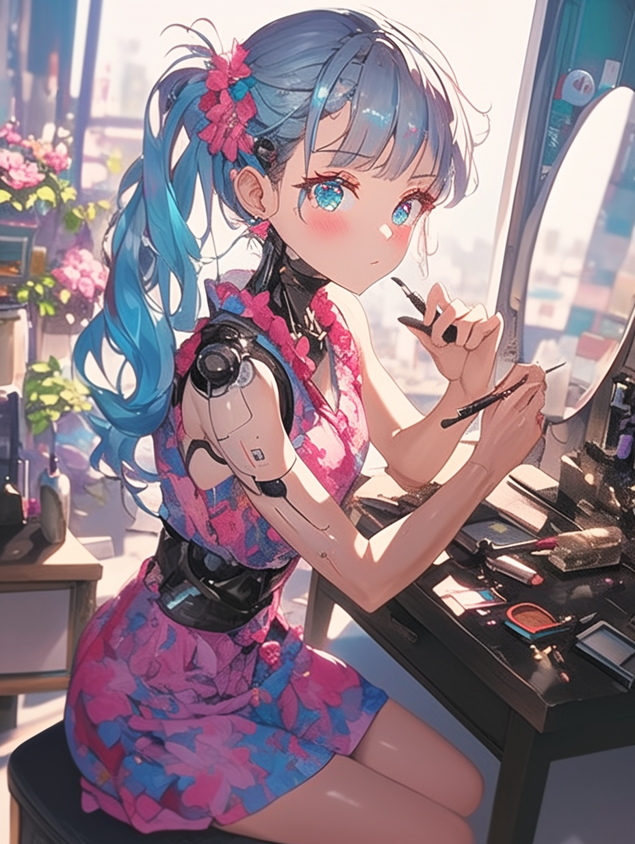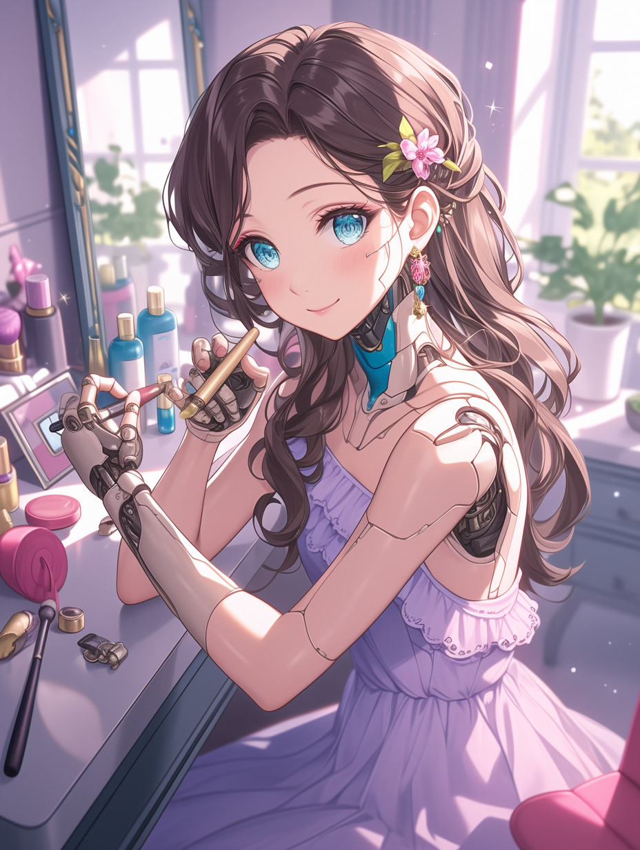 Cyborg girl putting on makeup before going on a date
