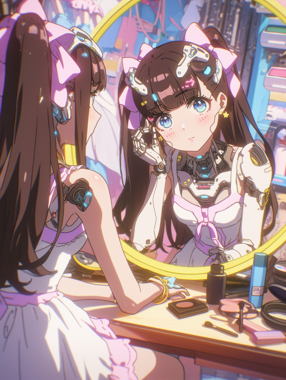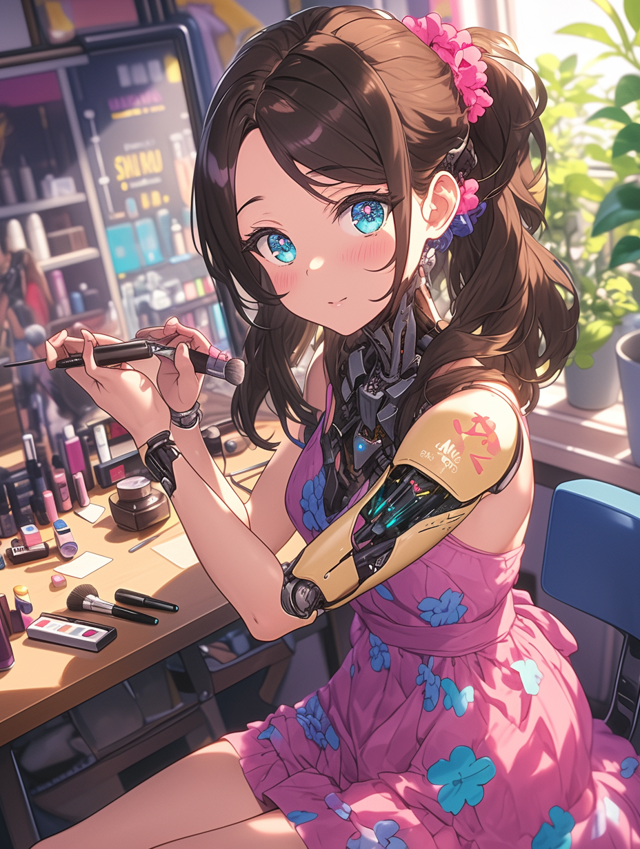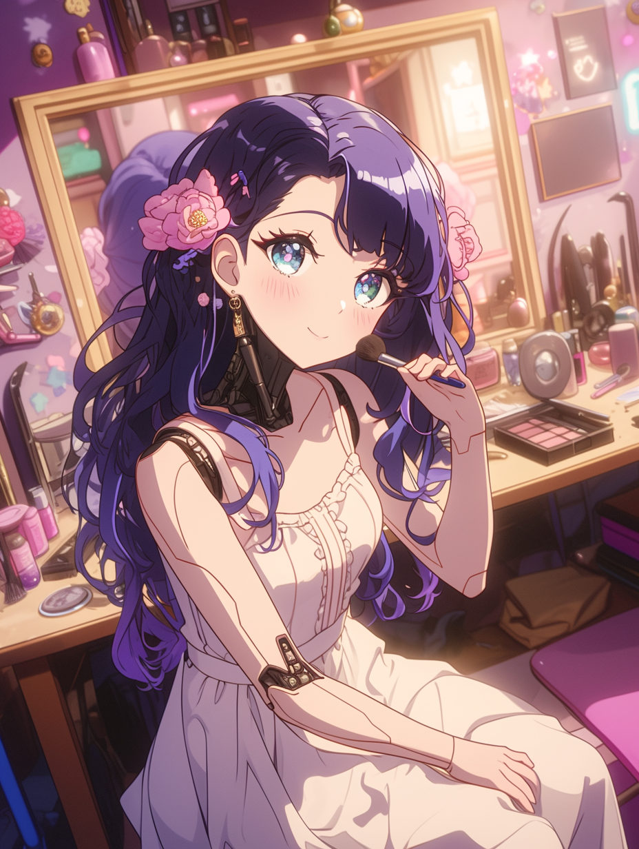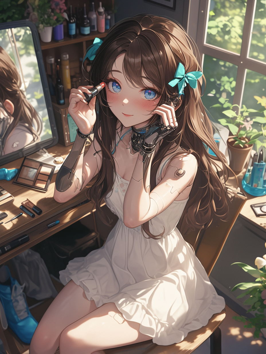 Cyborg girl putting on makeup before going on a date