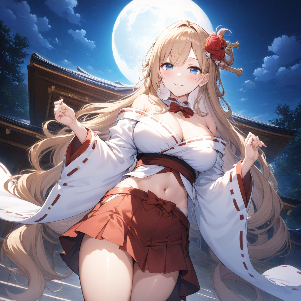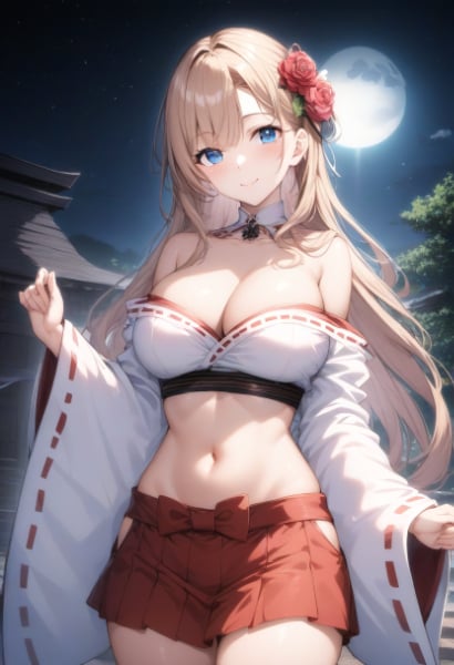 prompt: 1girl, solo, mature, large breasts, Japanese shrine miko in front of navel,midriff,navel cut out, off shoulder,mini skirt,, beautiful detailed face and eyes, smile, , , long hair, blond hair, off shoulder,cleavage,diagonal bangs, red flower hair ornaments, blue eyes, Japanese shrine, (night:1.2), (moon:2.0), mid, masterpiece,BREAK,{{{ai-generated}}},highres,HDR,{{{official art}}}, , best quality, amazing quality, very aesthetic, absurdres, best quality, amazing quality, very aesthetic, absurdres, best quality, amazing quality, very aesthetic, absurdres,{{ai-generated}}},(rose:1.3), amazing quality, very aesthetic, absurdres, best quality, amazing quality, , best quality, amazing quality, very aesthetic, absurdres