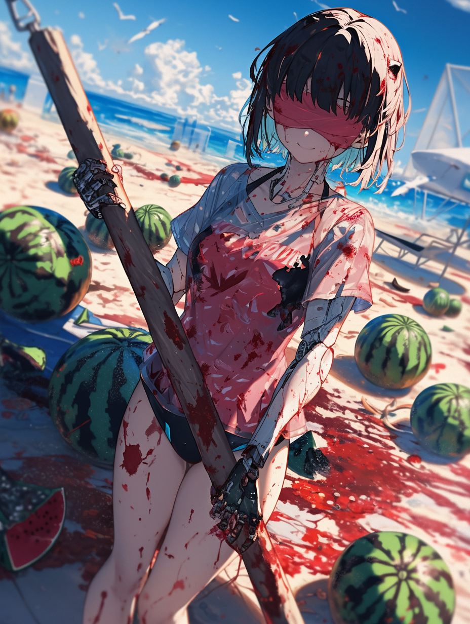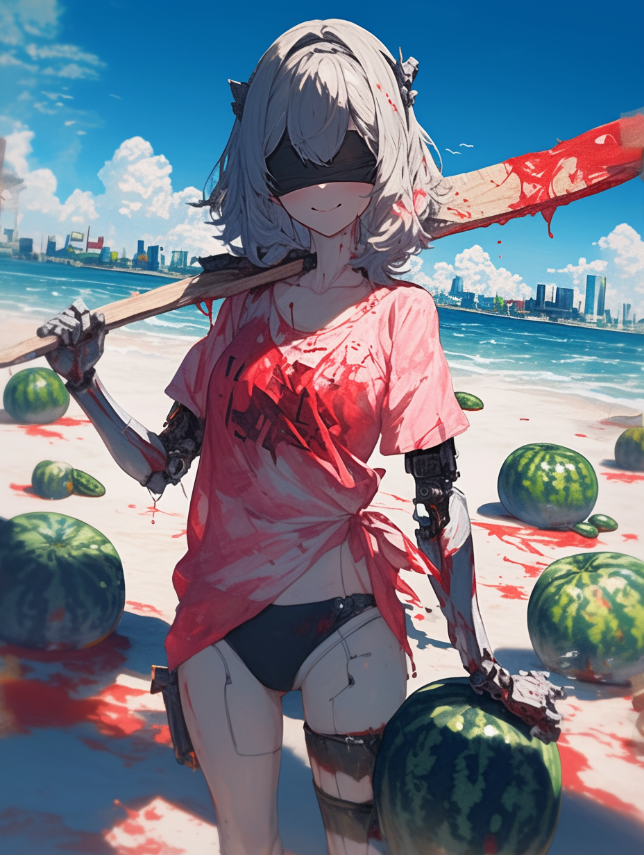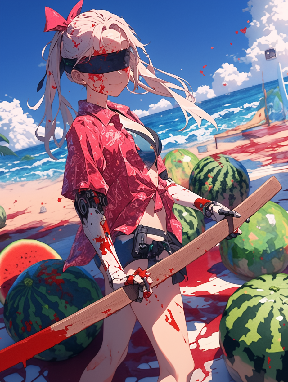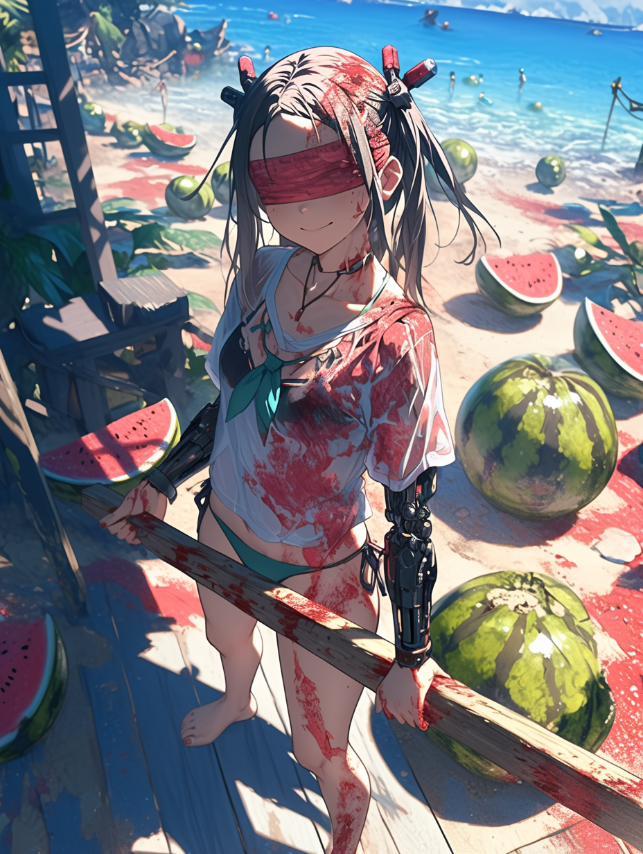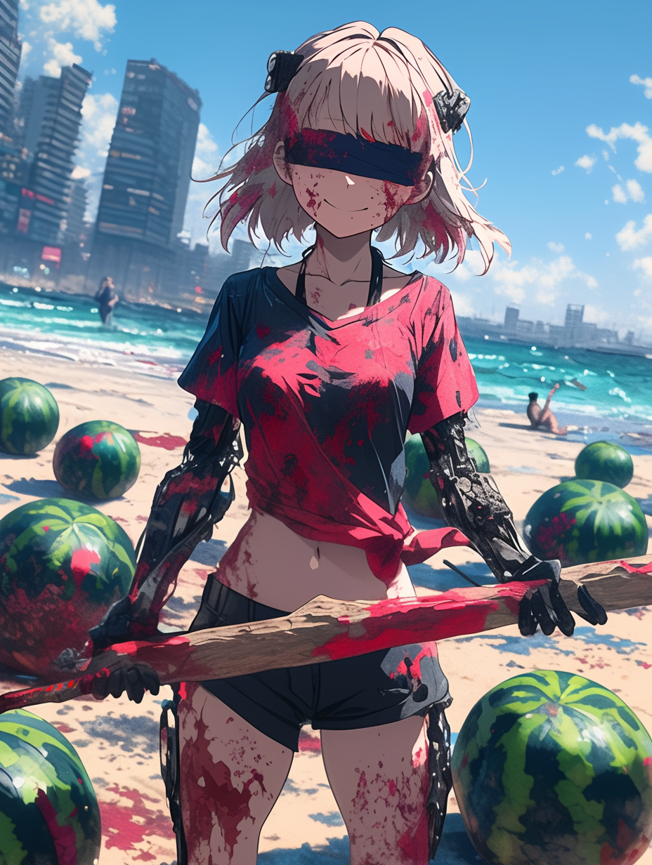 Cyborg girl on the beach and the tragedy of watermelons