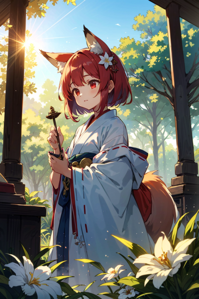 旭日を浴びる妖狐の巫女さま