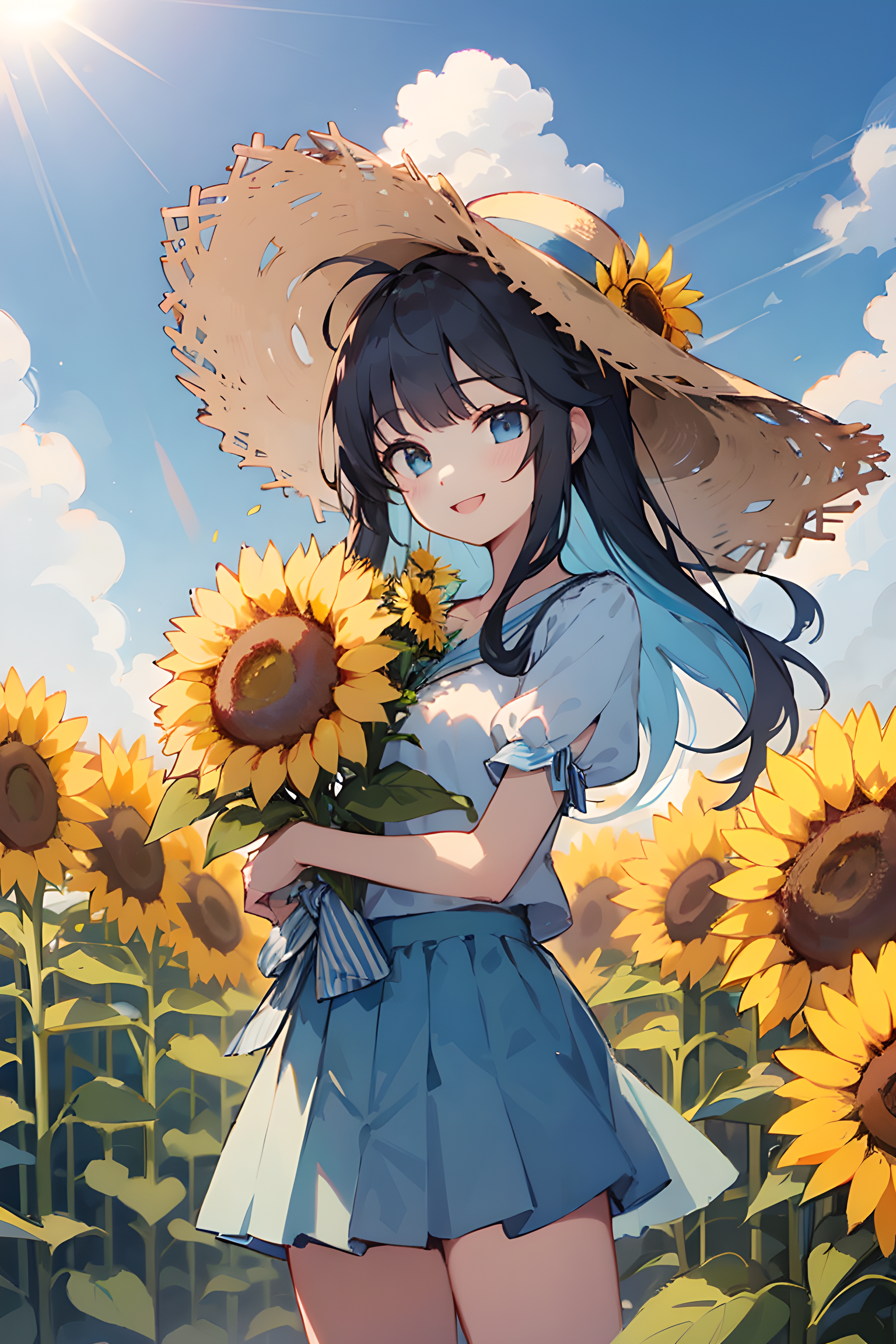 parameters: masterpiece, best quality, extremely detailed,1girl,hold a bouquet of sunflower in both hands,short sleeve,puff sleeve,onepiece,mini skirt,straw hat,ahoge,longhair,black hair,tall,skinny type,small bust, idol,kpop,ojou-sama,standing,smiling,original character,my child,colorful,day,clear sky,blue sky,sunshine,sunlight,summer,sunflower,flower,garden, <lora:eyecolle_portulaca_v100:1> <lora:deluster1:1>