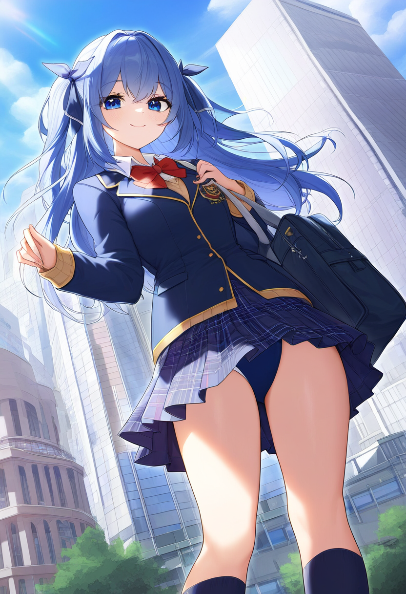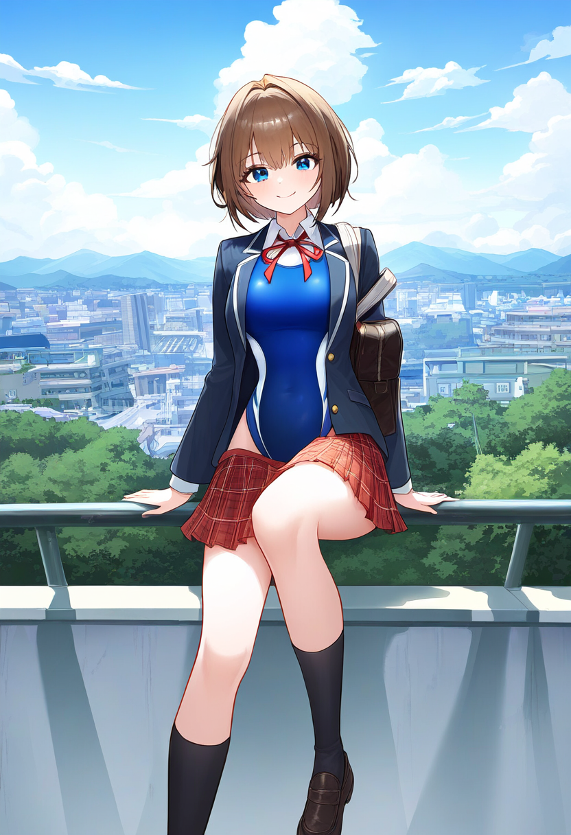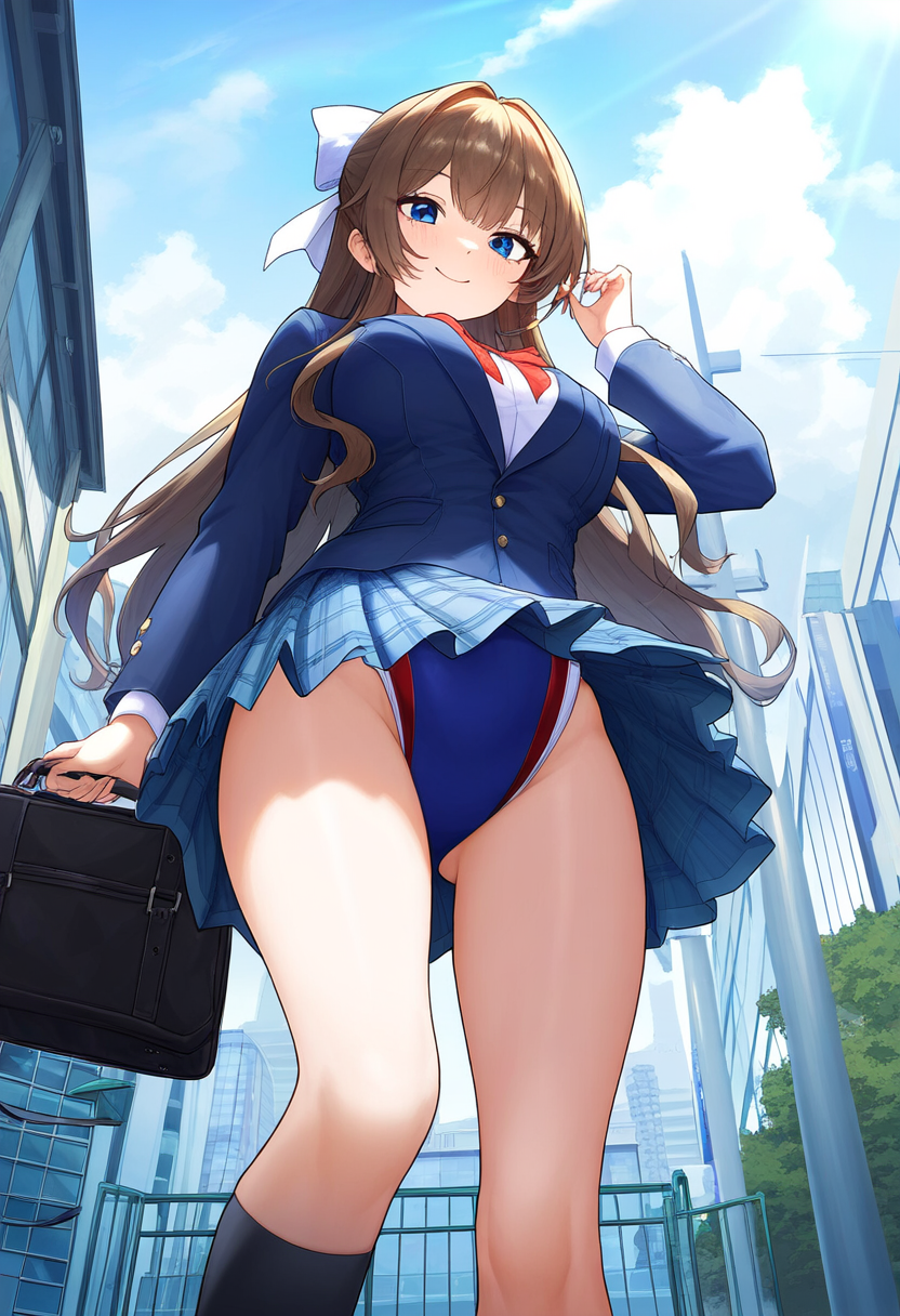 prompt: {clear and beautiful, wallpaper 8k CG,master piece},city,student, smile,1girl ribbon , {best quality}, {very aesthetic}, {school uniform, jacket, looking at viewer, from below,socks, , plaid skirt, white shirt,pleated skirt, bag, long sleeves, blazer,{{{{{skirt competition swimsuit}}}}}, {ultra-detailed}, {best illustration}, quality, very aesthetic,, best quality, amazing quality, very aesthetic, absurdres