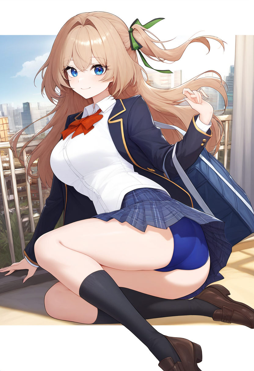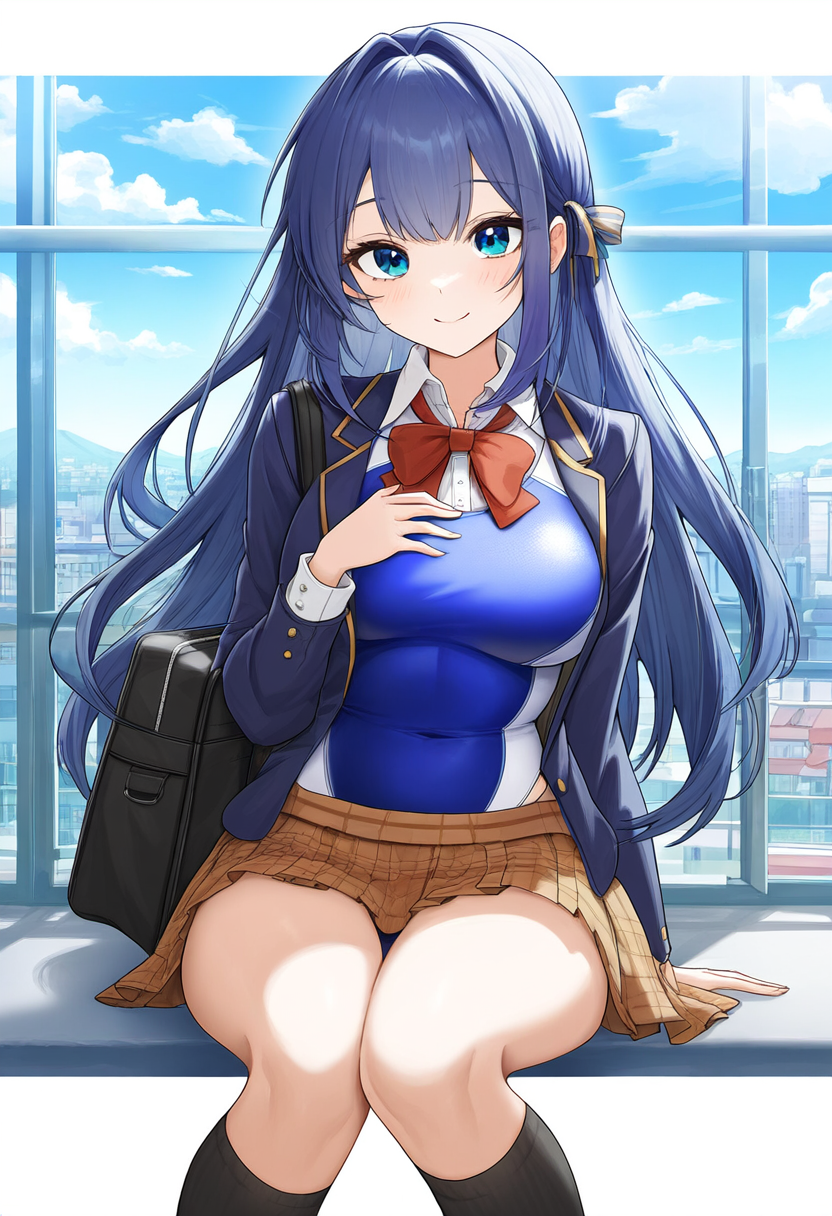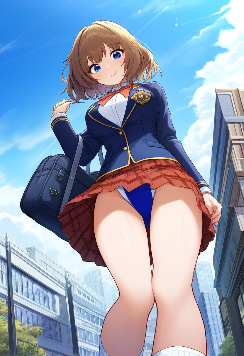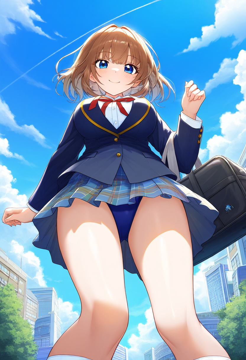 prompt: {clear and beautiful, wallpaper 8k CG,master piece},city,student, smile,1girl ribbon , {best quality}, {very aesthetic}, {school uniform, jacket, looking at viewer, from below,socks, , plaid skirt, white shirt,pleated skirt, bag, long sleeves, blazer,{{{{{skirt competition swimsuit}}}}}, {ultra-detailed}, {best illustration}, quality, very aesthetic,, best quality, amazing quality, very aesthetic, absurdres