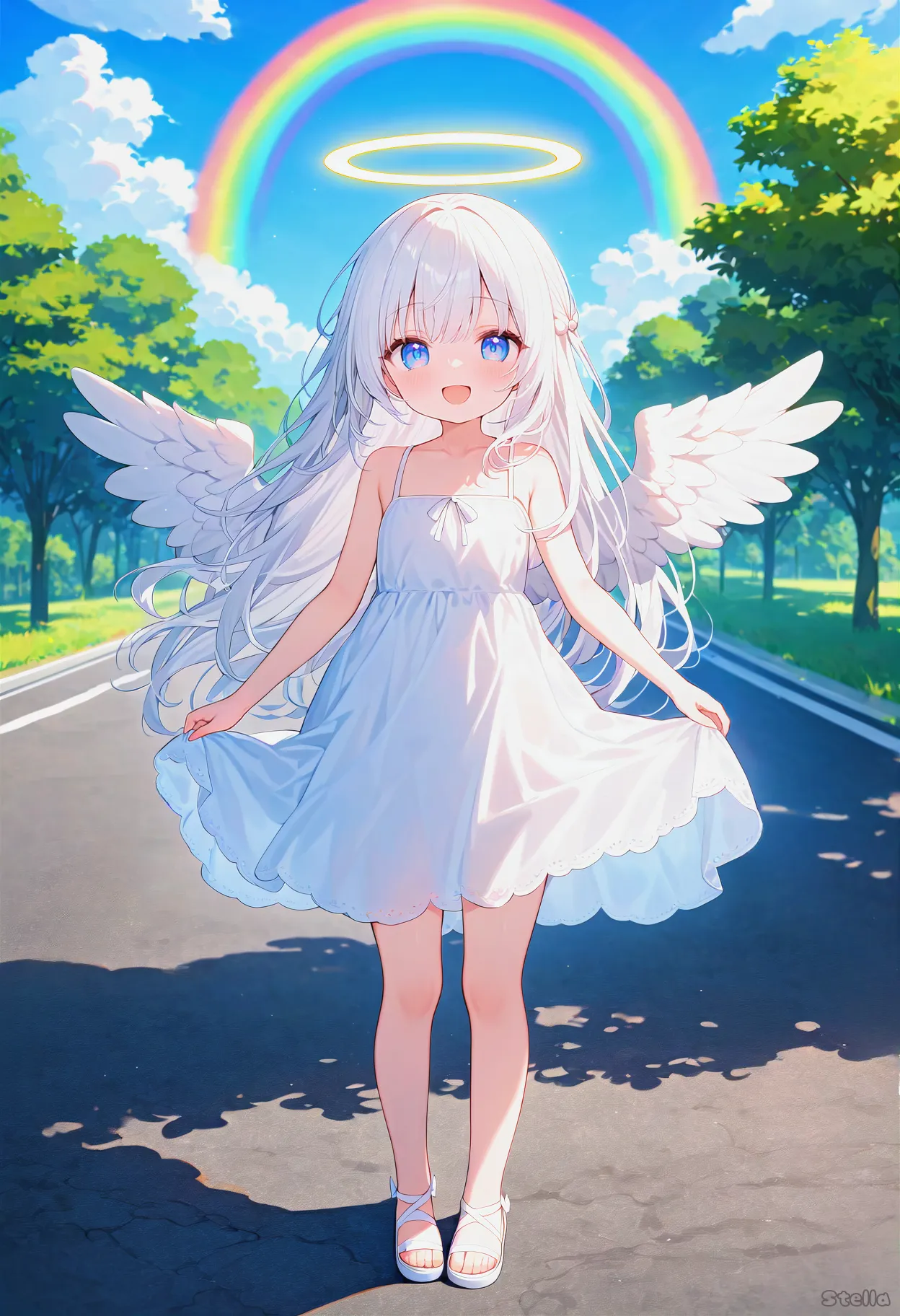 parameters: 1girl, (loli), solo, white hair, long hair, angel girl, angel wings, halo, sky, blue sky, summer, day, asphalt, looking at viewer, smile, white dress, full body, road, tree, open mouth, rainbow, masterpiece, best quality, very aesthetic, absurdres