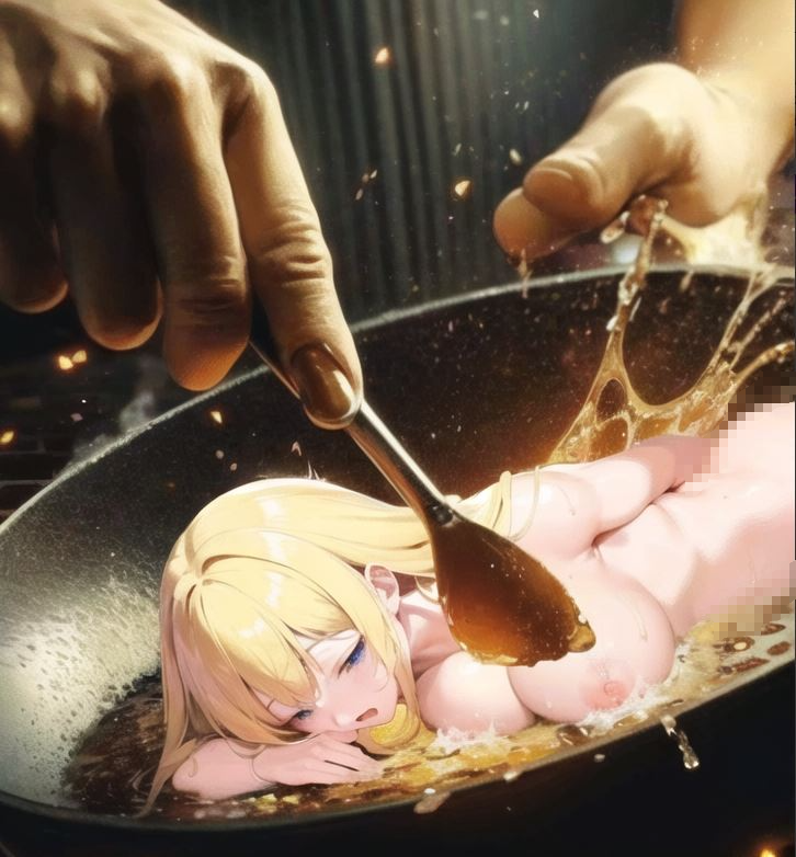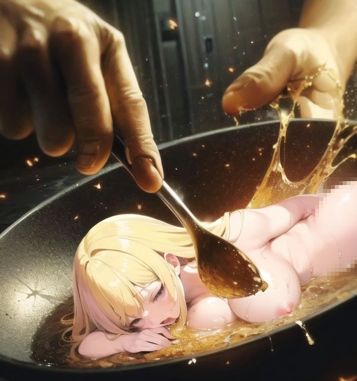 ヘラで乳房をフライパンの床に押し当てられ逃げられない魔法少女。