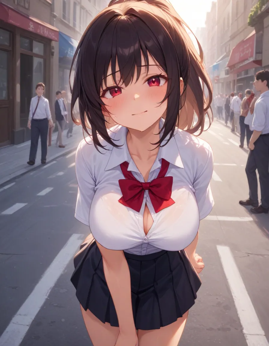 路上露出する制服姿の人妻
