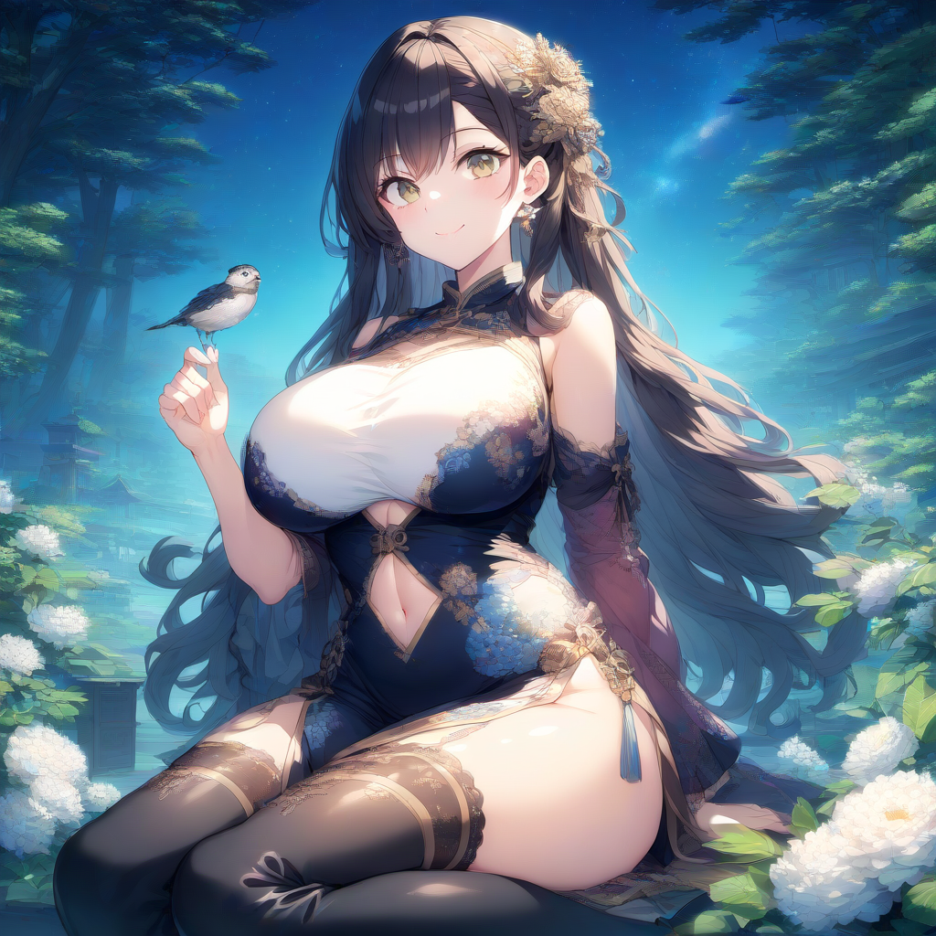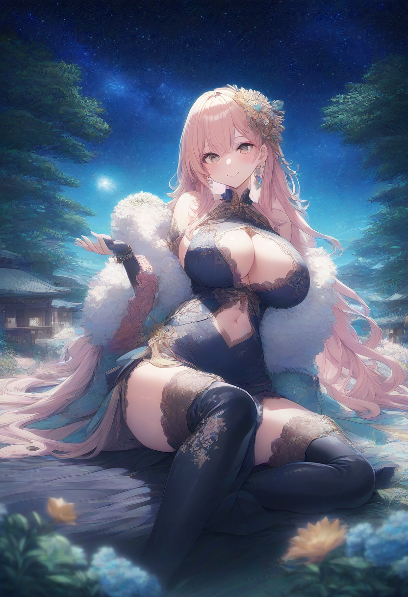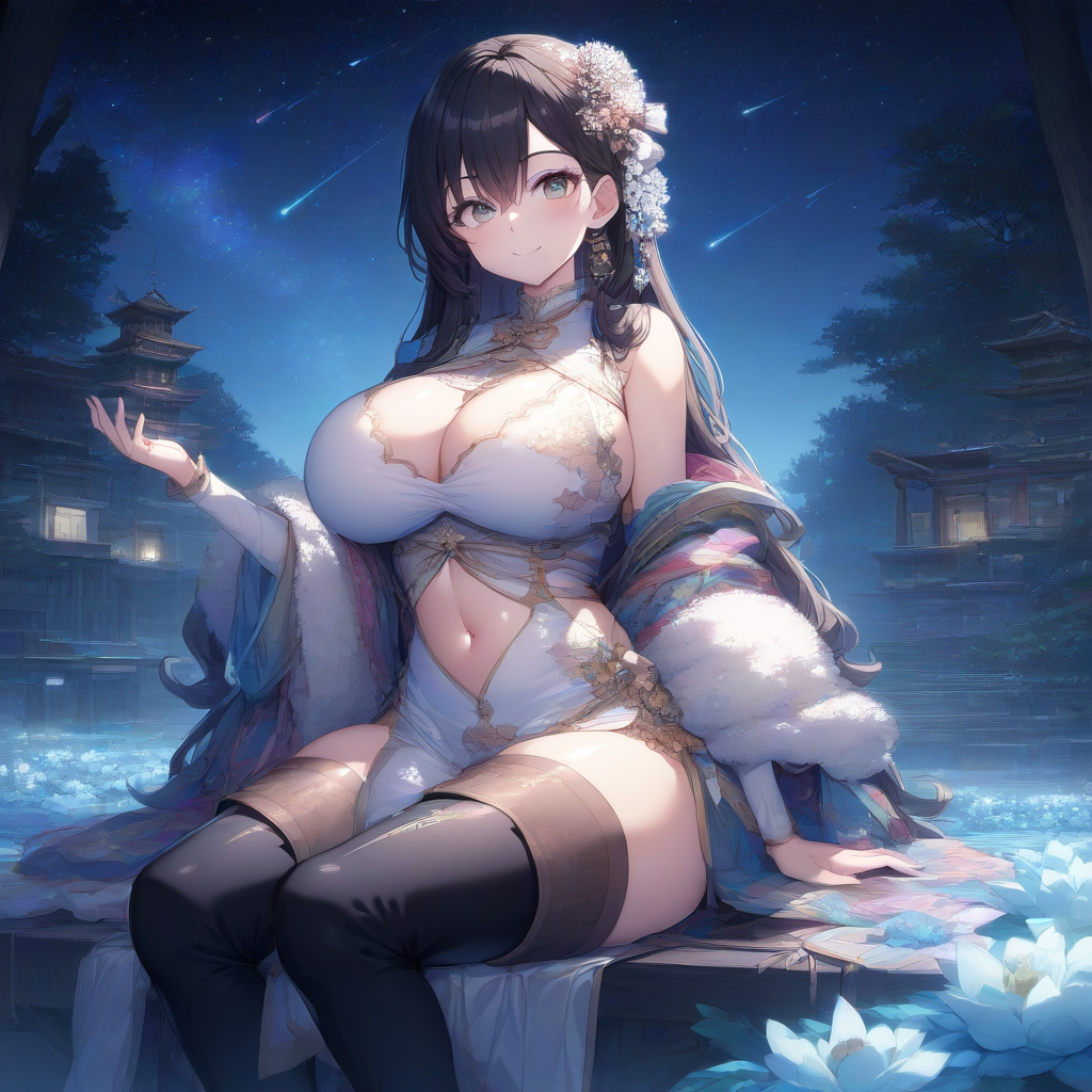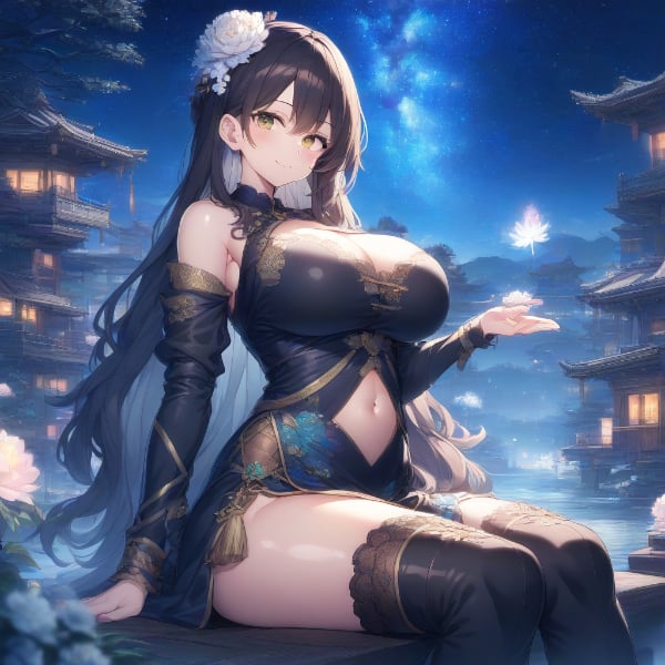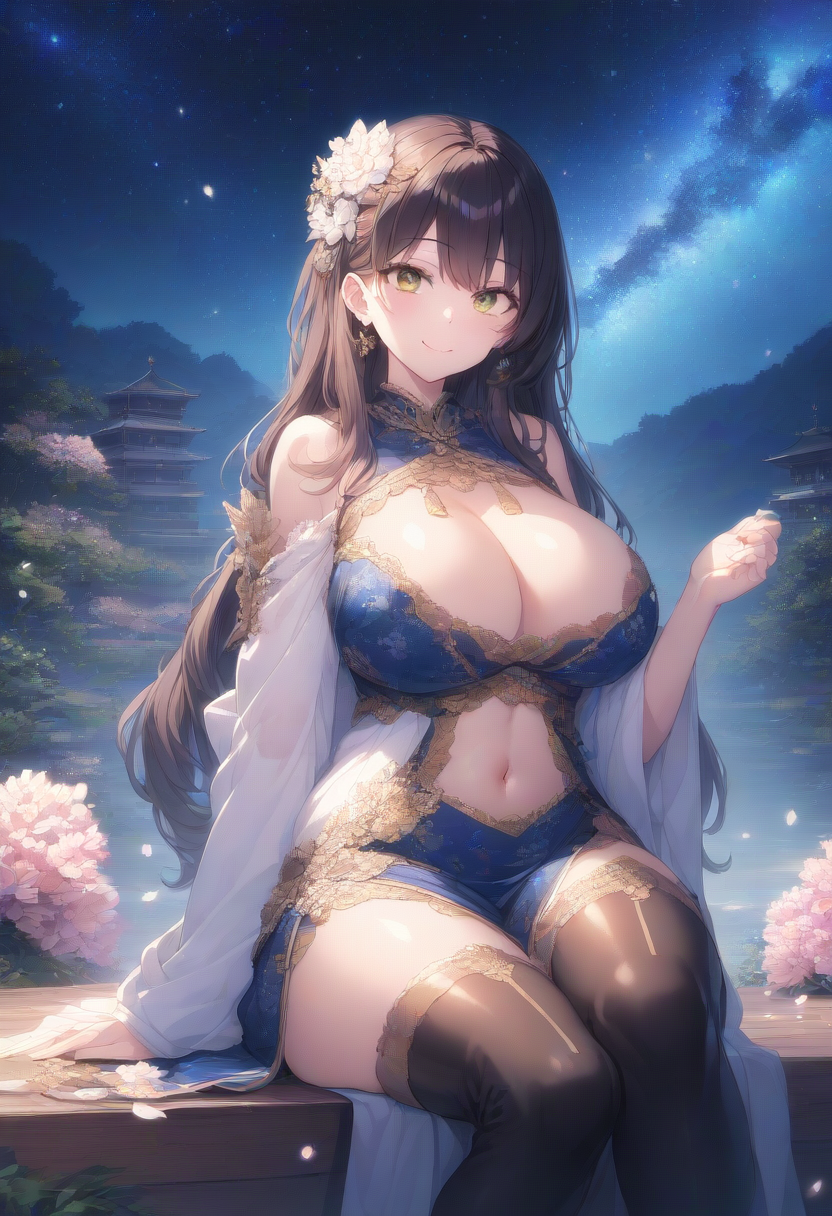prompt: ({{{masterpiece}}}, {{{best quality}}},(huge breasts:1.2),sitting,{{{extremely detailed}}},,illustration, {{solo}}, {1 girl}, smile, (black long hair:1.5),(cute face),(navel)(thigh boots:1.5),china dress in front of navel,midriff,navel cut out,shiny,,Break,japanese flower hair ornament, depth of field, ,colorful, [✊], closed mouth,{{ai-generated}}},, nature, galaxy,japanese fantasy,, star, night,, (🎇), {⭐}{{{, , best quality, amazing quality, very aesthetic, absurdres , best quality, amazing quality, very aesthetic, absurdres
