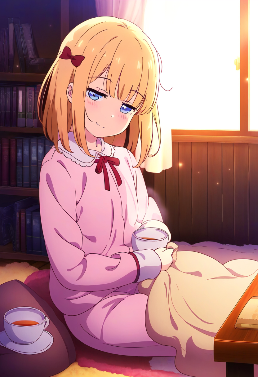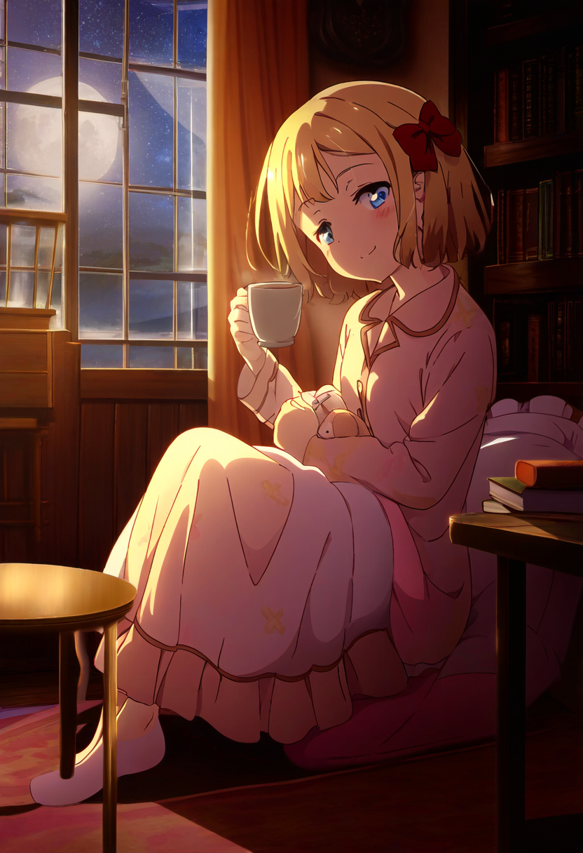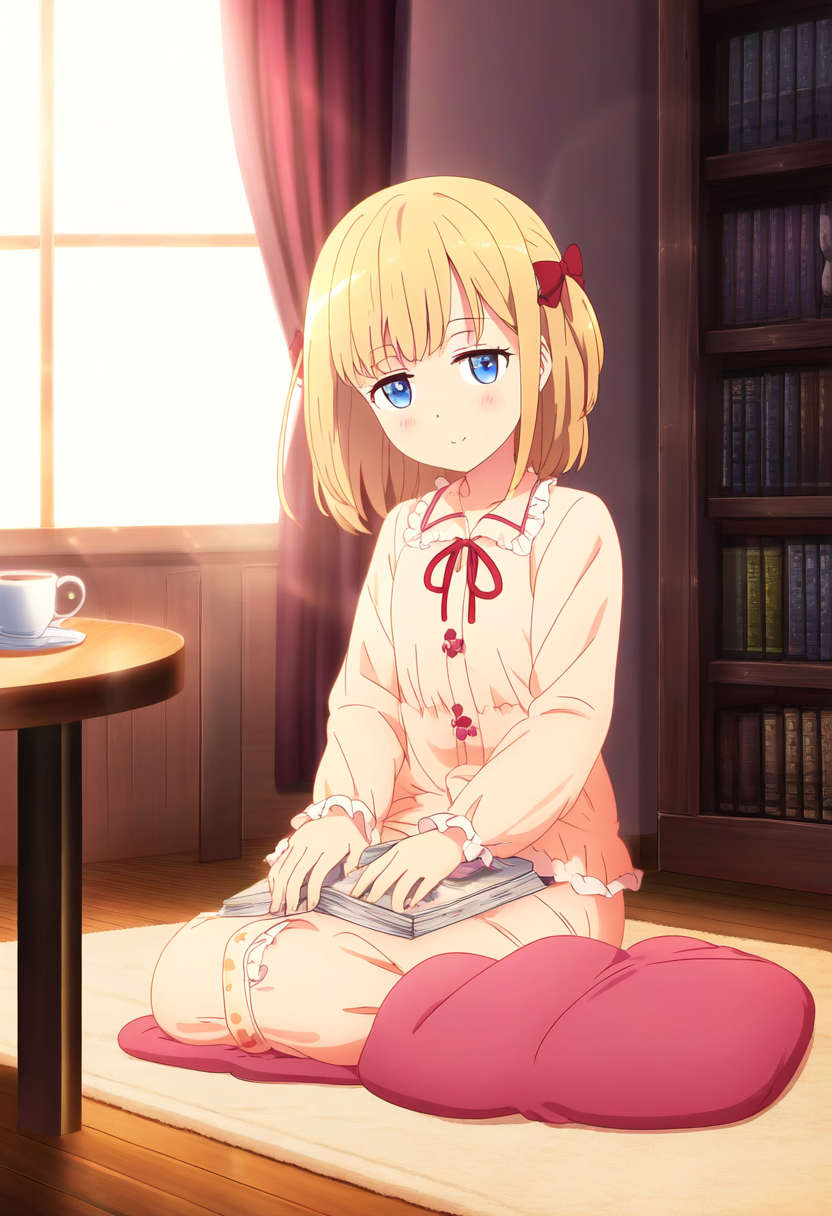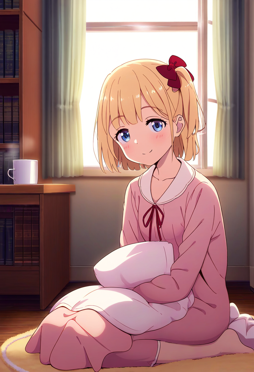 prompt: 1girl, solo, indoors, sitting, short blonde hair, blue eyes, (hair bow:1.4),red bow,red ribbon in hair, sleepy expression, small chest, anime style, detailed room, cozy atmosphere, soft lighting, wooden floor, fluffy carpet, books on shelves, window with curtains, moonlight coming through, pajamas, holding a small pillow, head tilting to the side, eyes half-closed, relaxed posture, legs crossed, arms resting on lap, gentle smile, delicate features, soft blush, room filled with soft colors, peaceful and quiet, calm night, gentle breeze from window, starry night visible, plush toys around, warm blanket nearby, small table with tea cup, subtle shadows, best quality, amazing quality, very aesthetic, absurdres