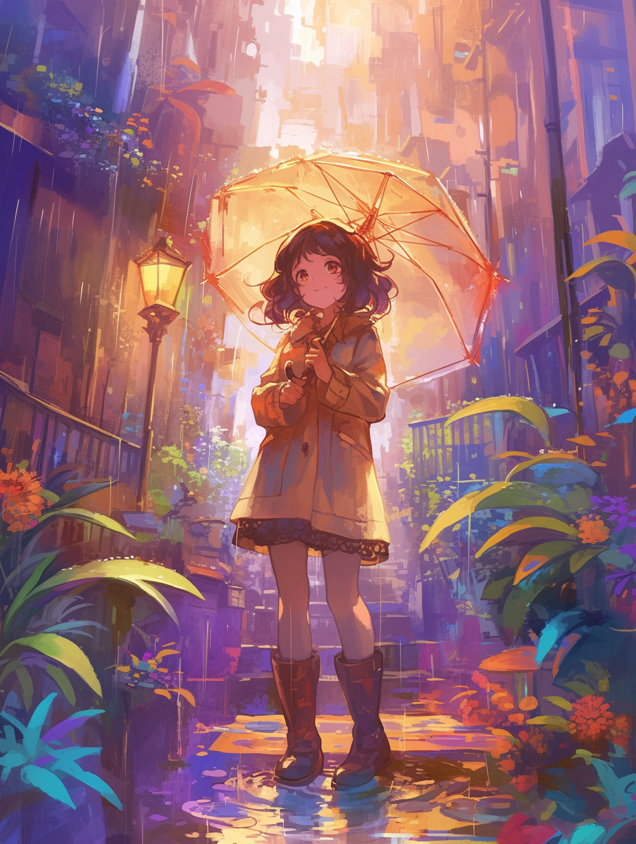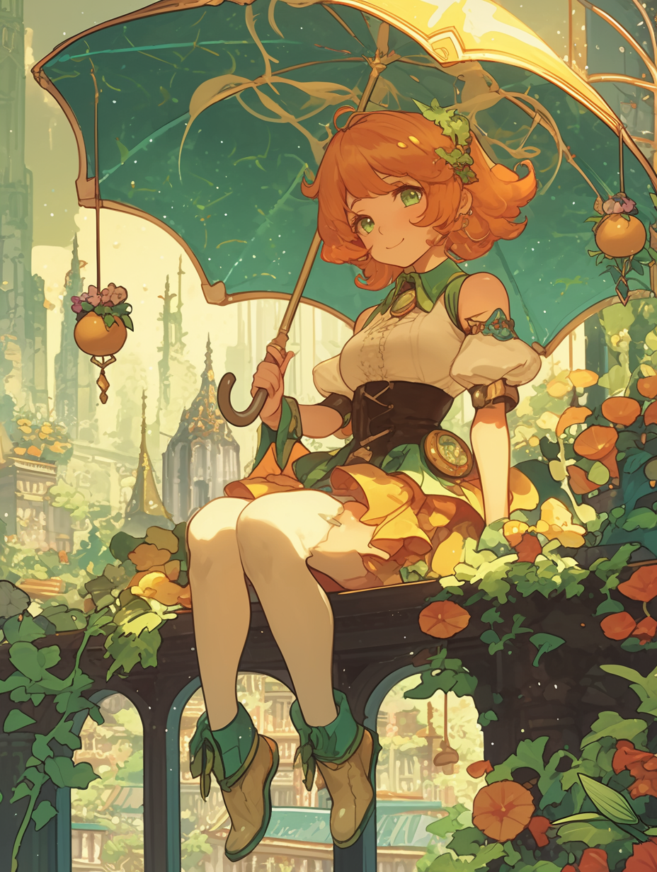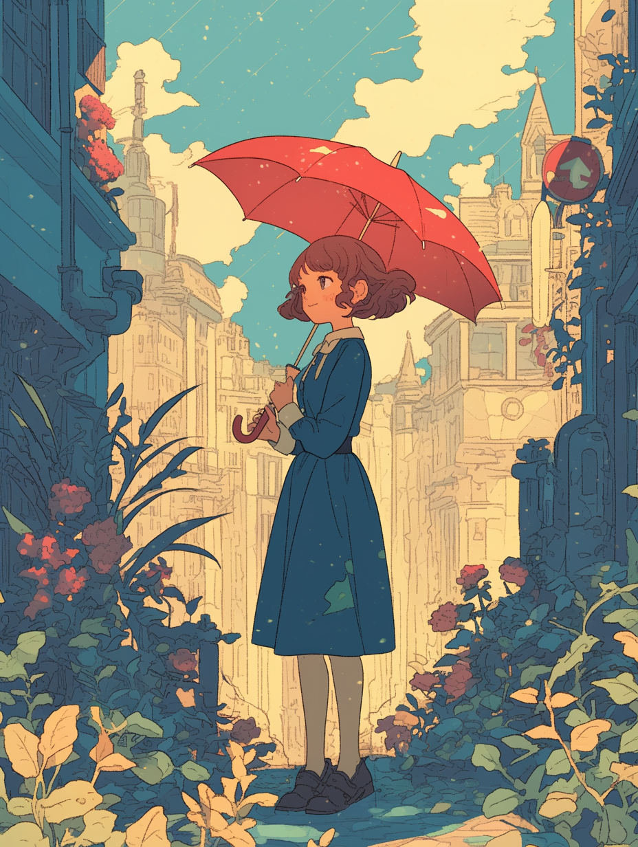 雨 女の子 アールヌーボー アニメ 傘 街 植物