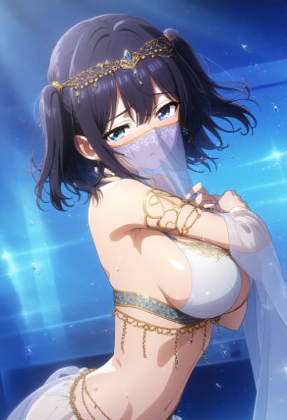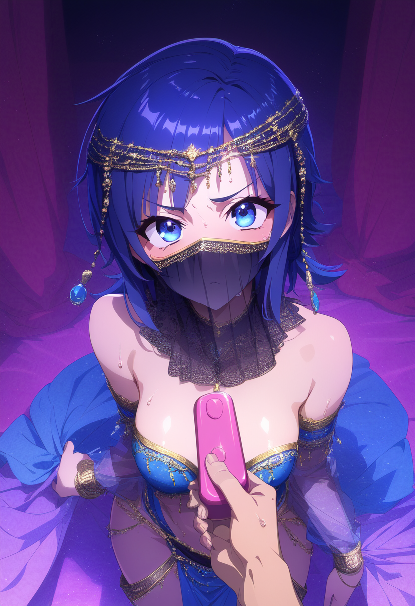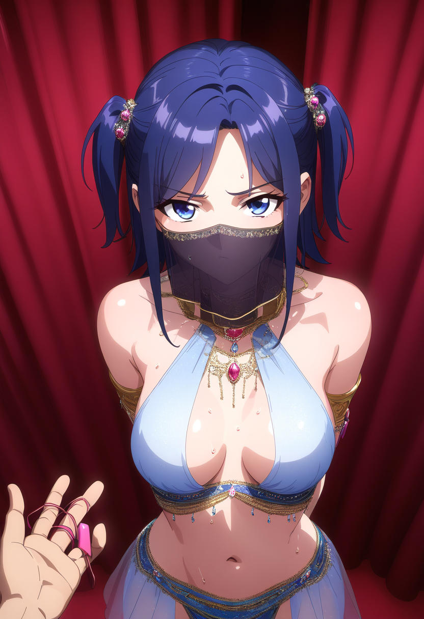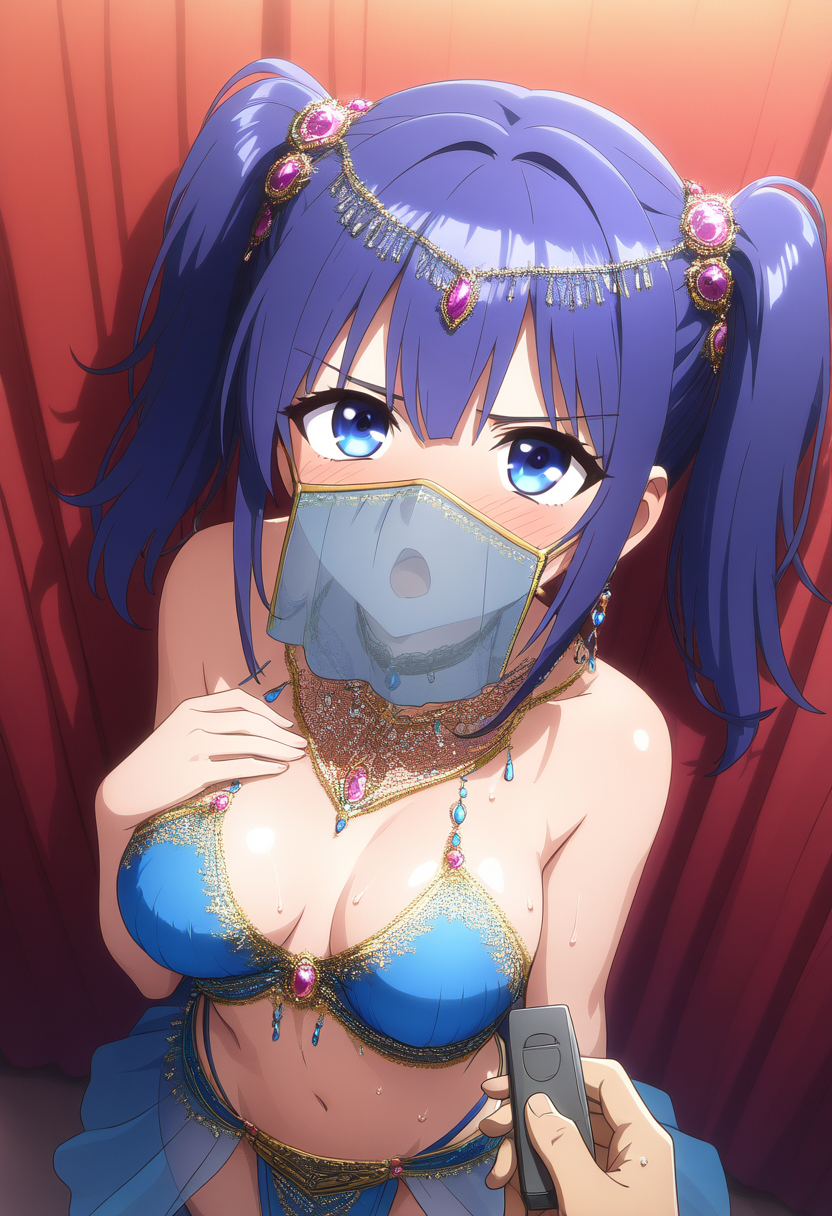 prompt: official style, {anime coloring},[[ai-assisted]],{NSFW},{{very aesthetic}}, {{best quality}}, {{accurately described}}, {{perfect aesthetic}} {{perfect best quality}},(ultra-highres,extreme detailed,insanely detailed, highest detailed,(illustration),17 years old belly dancer girl,(gallant face:1.0), (cute:1.3), {{dynamic angle},fantasy,slender, kawaii, ultimate detailed perfect face,ultra cute face girl,ultra detailed Watery blue eyes,super lustrous detailed skin,ultra detailed {{deep blue} medium hair,twintail,large breasts, narrow waist,{{in small luxury room,Lace curtains},{{hair ornaments,{{{see-through girl\'s mouth covering dancer\'s Cloth mask,}embroidered chiffon skirt,detailed embroidered belly dancer costume}},{{{{{hetero,1pure girl standing,{{{A man\'s palm of a man\'s hand holding out elotic sex vibrators},her arms behind back}},{{Bravely Glaring with {{Embarrassing} at viewer},sweat,from up above front view,{{focus {{elotic sex vibrators} in the palm of a man\'s hand and her upper body },looking at viewer,pov