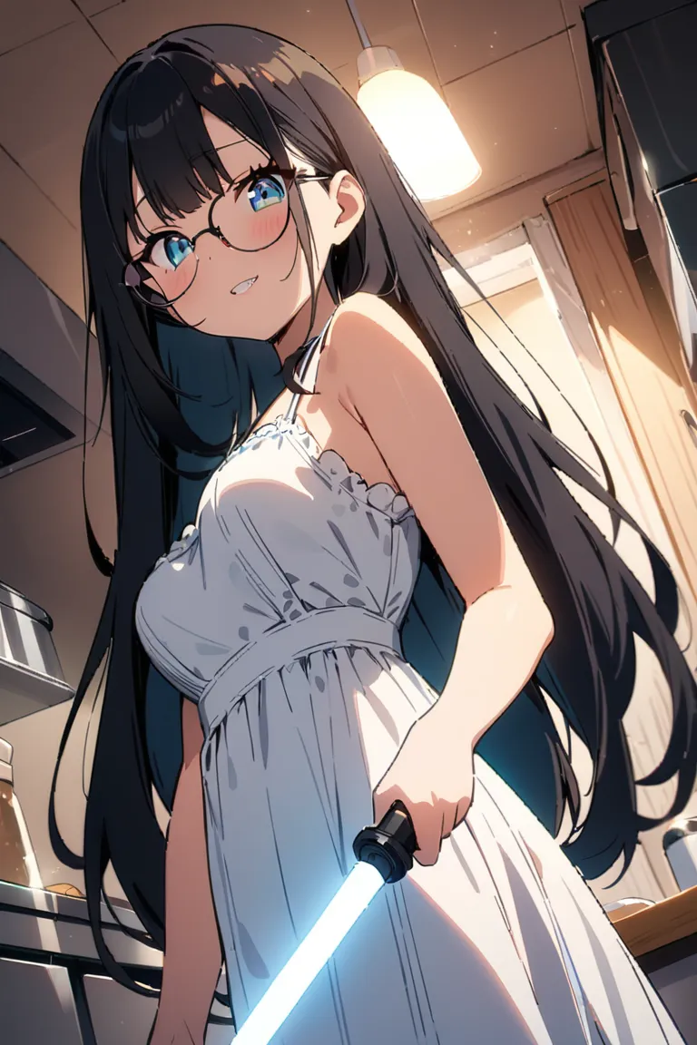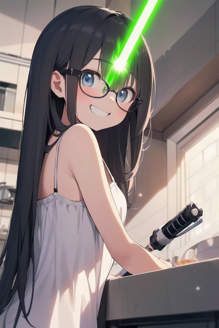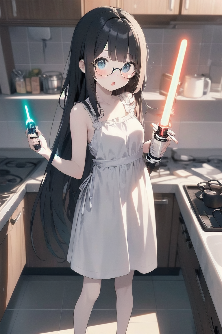 parameters: ((masterpiece)), ((best quality)), (ultra-detailed), ((kawaii)), cute, (lovely), illustration, anime style, (Dutch angle shot:1.2), (skewed shot:1.3), (from below:1.2), (kitchen:1.4), a cute girl, solo, upper body, upper body focus, (pure white sundress:1.3), sleeveless, beautiful black hair, (Straight long hair:1.2), slim, slender, medium breast, (beautiful eyes), (glasses:1.2), (evil grin:1.2), (looking down:1.1), (holding a Lightsaber at the ready:1.4), (lightsaber aimed to viewer:1.5), (cool lighting:1.3).