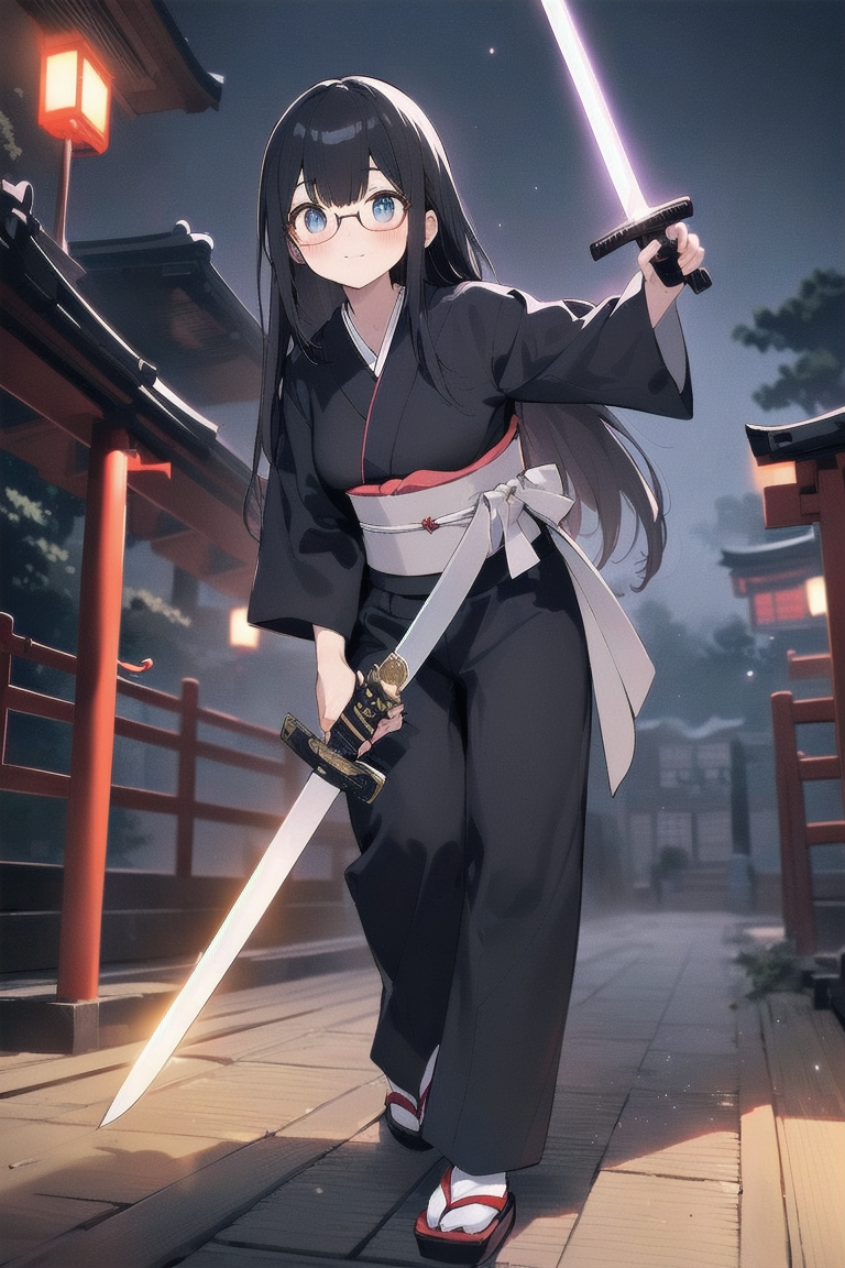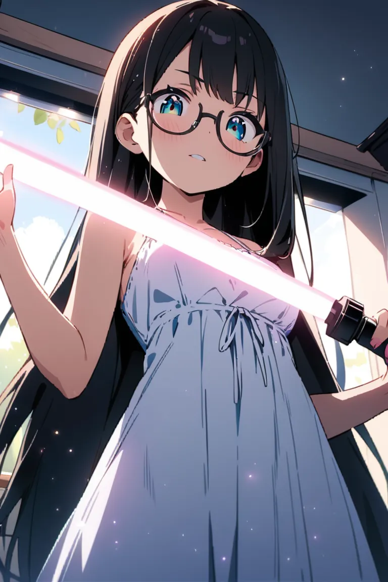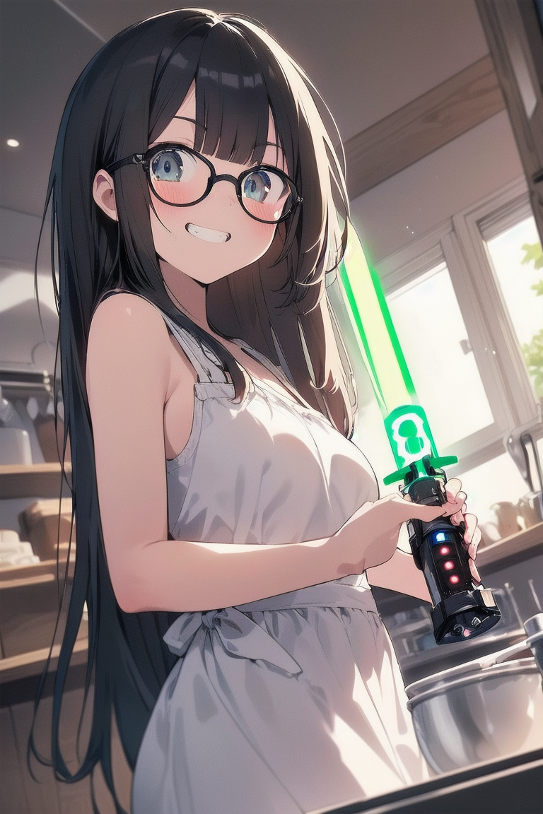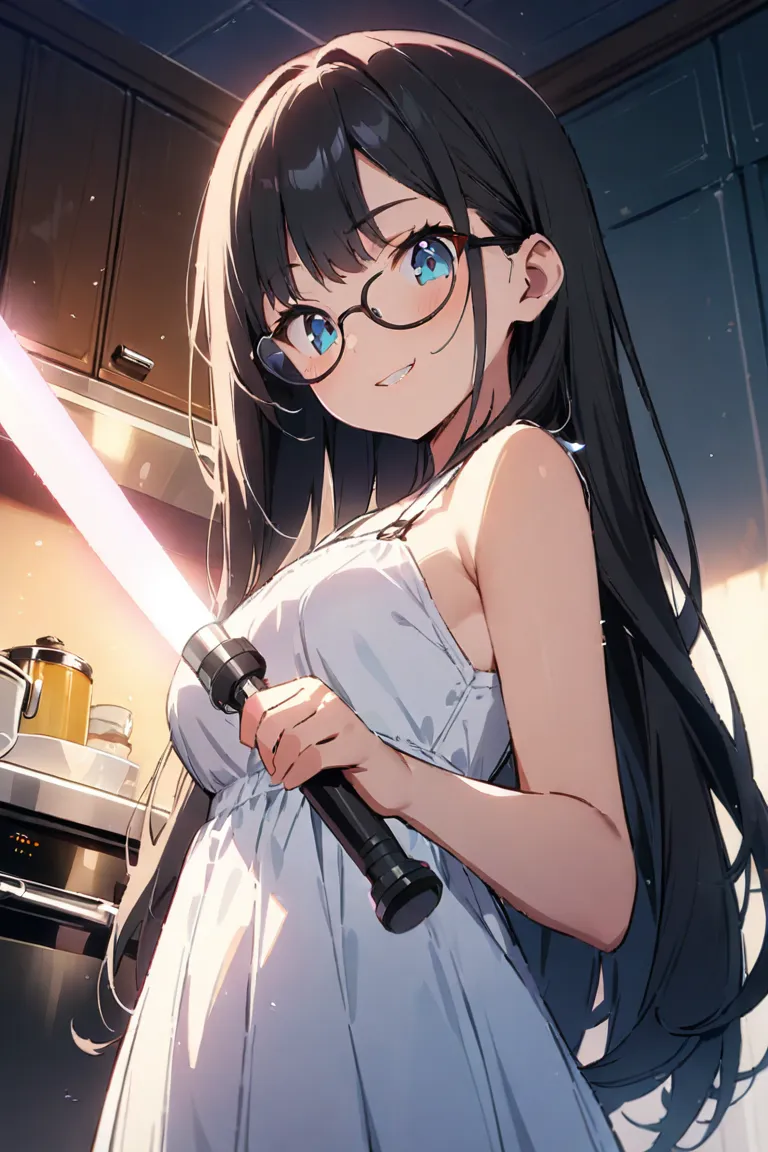 parameters: ((masterpiece)), ((best quality)), (ultra-detailed), ((kawaii)), cute, (lovely), illustration, anime style, (Dutch angle shot:1.2), (skewed shot:1.3), (from below:1.2), (kitchen:1.4), a cute girl, solo, upper body, upper body focus, (pure white sundress:1.3), sleeveless, beautiful black hair, (Straight long hair:1.2), slim, slender, medium breast, (beautiful eyes), (glasses:1.2), (evil grin:1.2), (looking down:1.1), (holding a Lightsaber at the ready:1.4), (lightsaber aimed to viewer:1.5), (cool lighting:1.3).