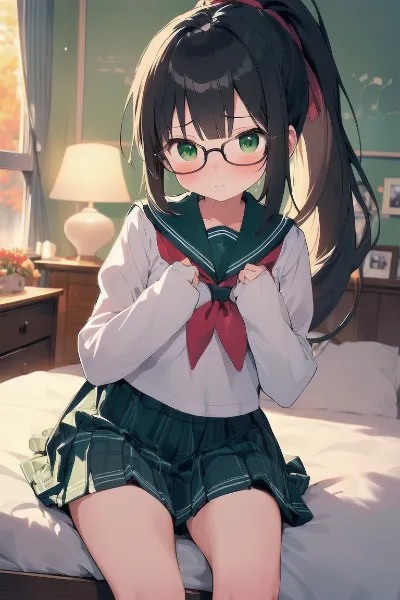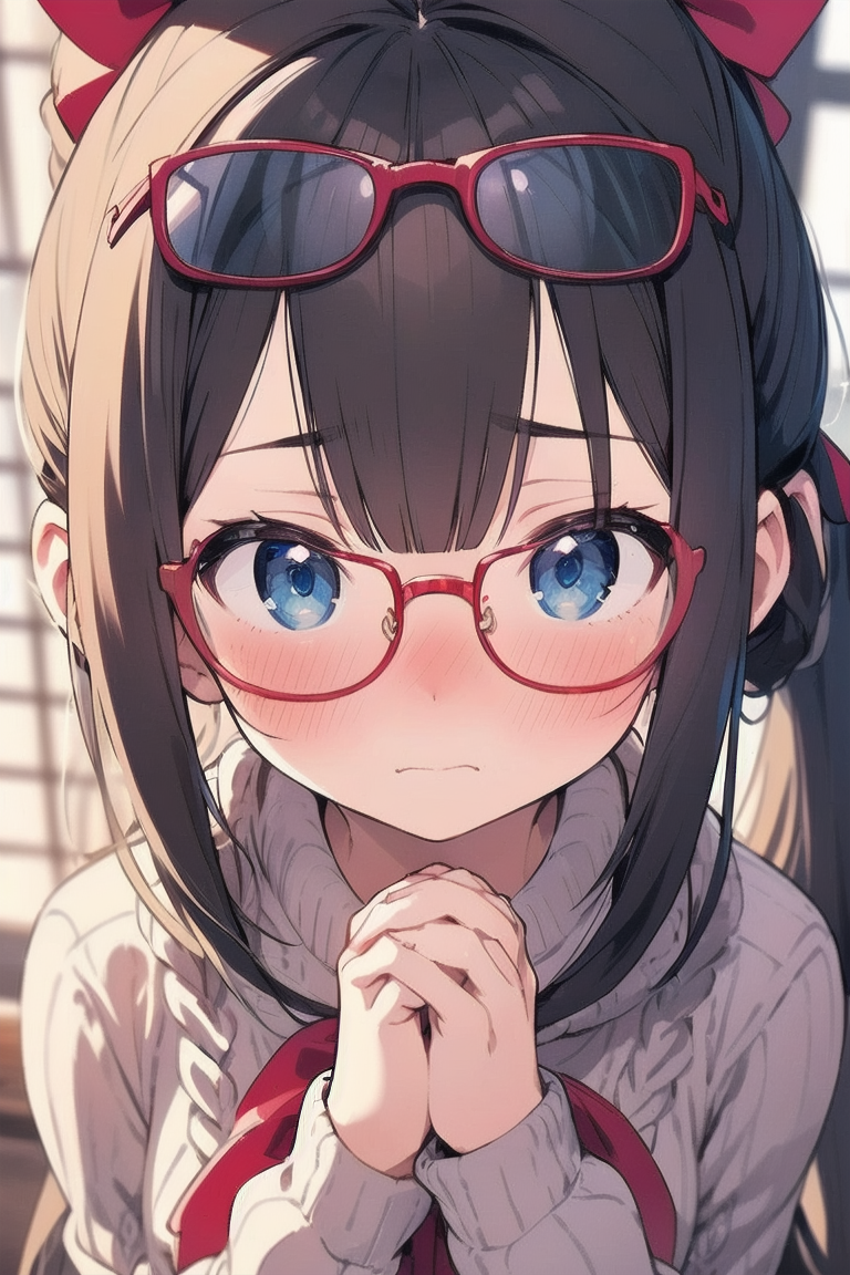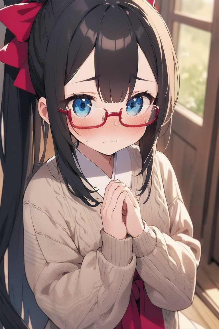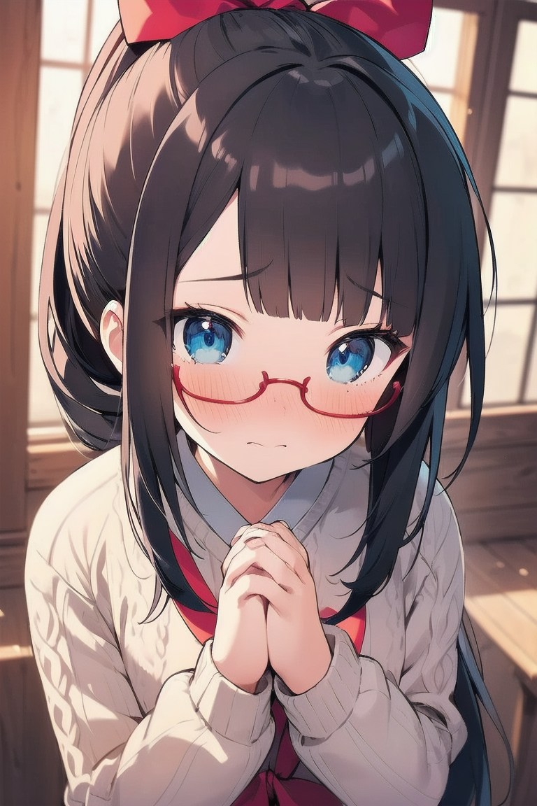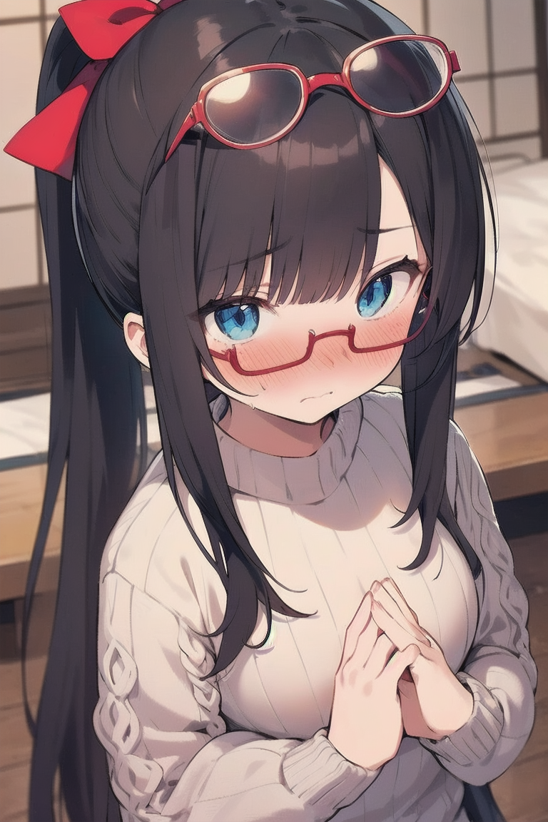 parameters: ((masterpiece)), ((best quality)), (ultra-detailed), ((kawaii)), cute, (lovely), illustration, anime style, (Japanese-style room:1.3), (from above), portrait, (close-up face:1.2), a cute girl, solo, (dress sweater:1.5), (sleeves past fingers:1.3), beautiful black hair, (Straight long hair:1.3), (ponytail:1.2), (a big red ribbon on head:1.5), slim, slender, small breast, (beautiful eyes), (blue eyes), (glasses:1.2), (own hands together:1.5), (Embarrassed expression:1.2).