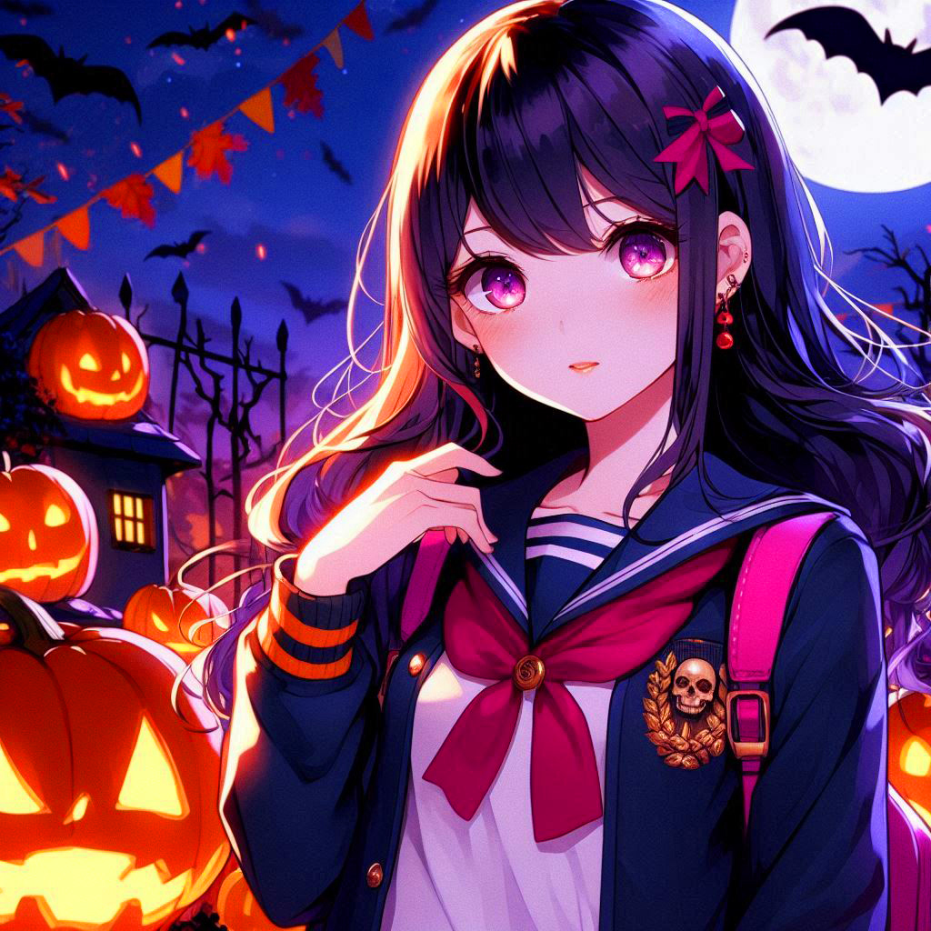 ジャケットを着た、ハロウィンの黒髪ロング少女★(2枚)