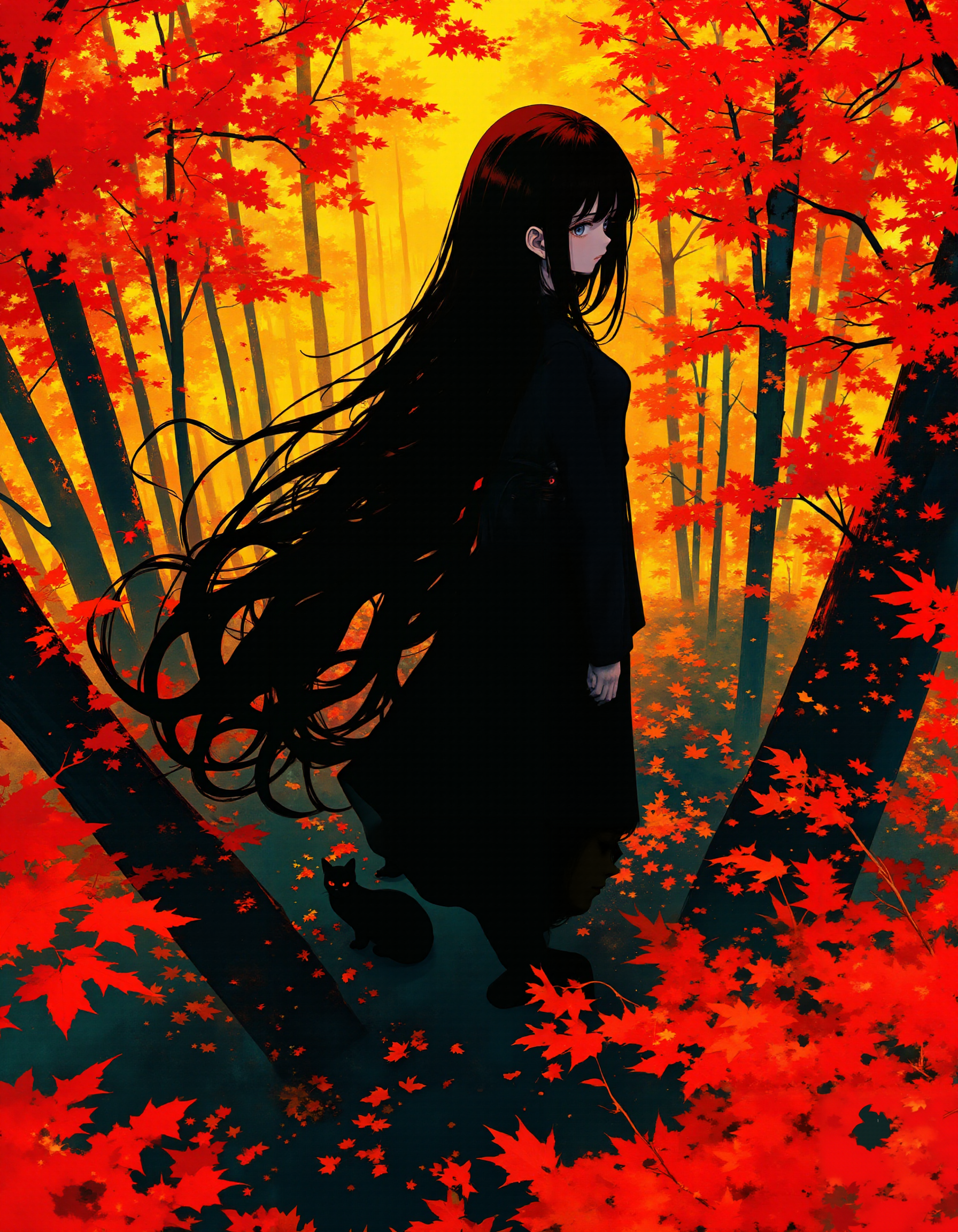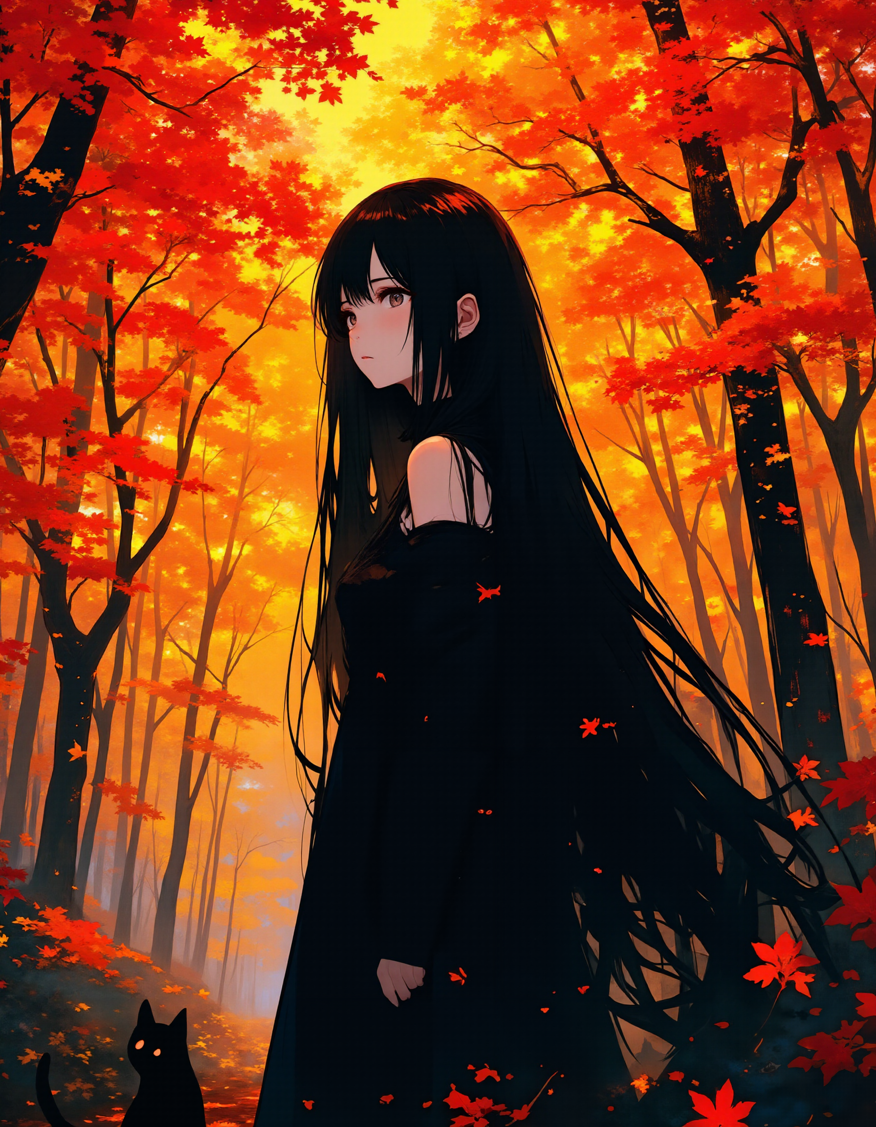 Autumn leaves and black-haired woman