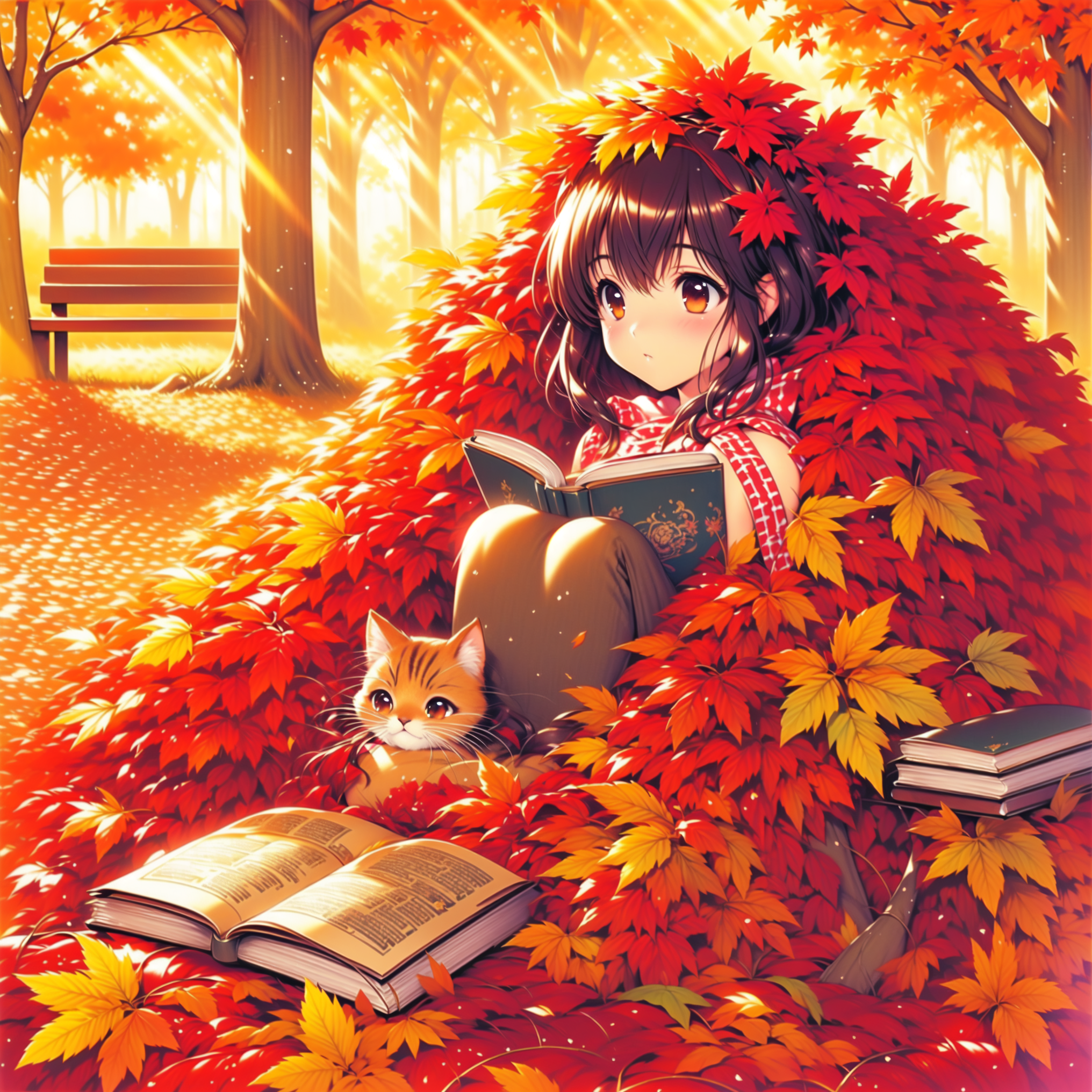 落ち葉が降り積もるほど長時間本を読んでいるシーンのつもりで生成したのですが、どう見てもわざわざ落ち葉の山を作って中に入り込んでいますね😅