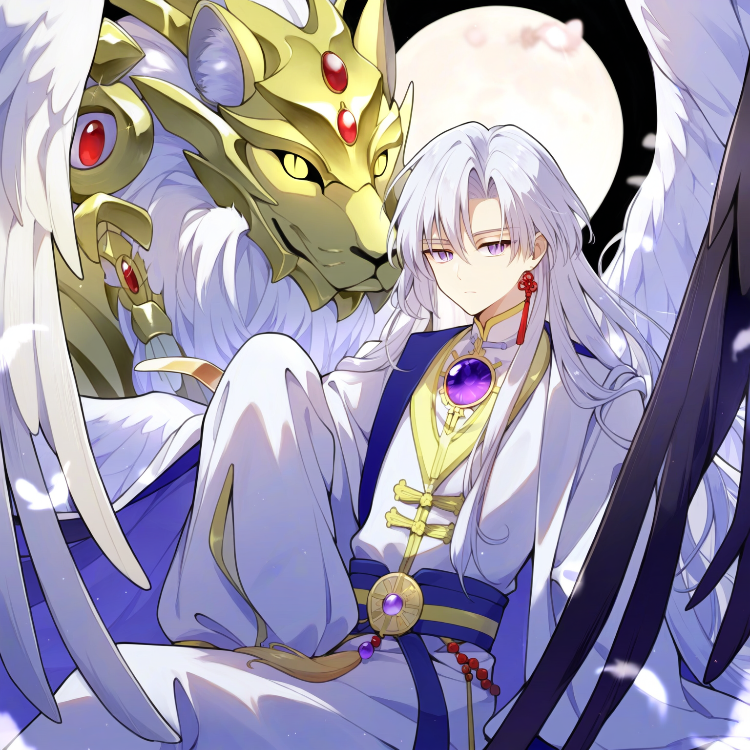 prompt: {{{best quality}}}, {{{very aesthetic}}}, male focus,kerberos, yue (cardcaptor sakura), 1boy, bishounen, purple eyes, slit pupils, expressionless, gem, long hair, looking at viewer, purple gemstone, shirt, tassel, white hair, white pants, white shirt, white wings, wings,,,,creature,yellow lion ,red gemstone, yellow eyes,silver helm, magic circle, black night, moon , best quality, amazing quality, very aesthetic, absurdres