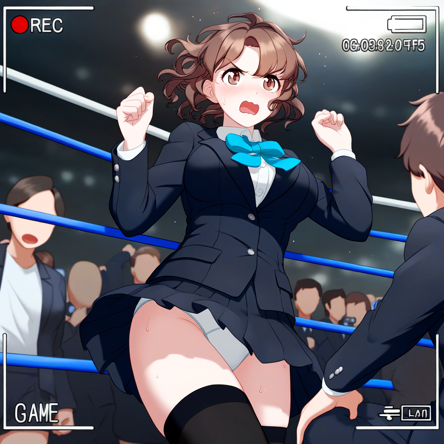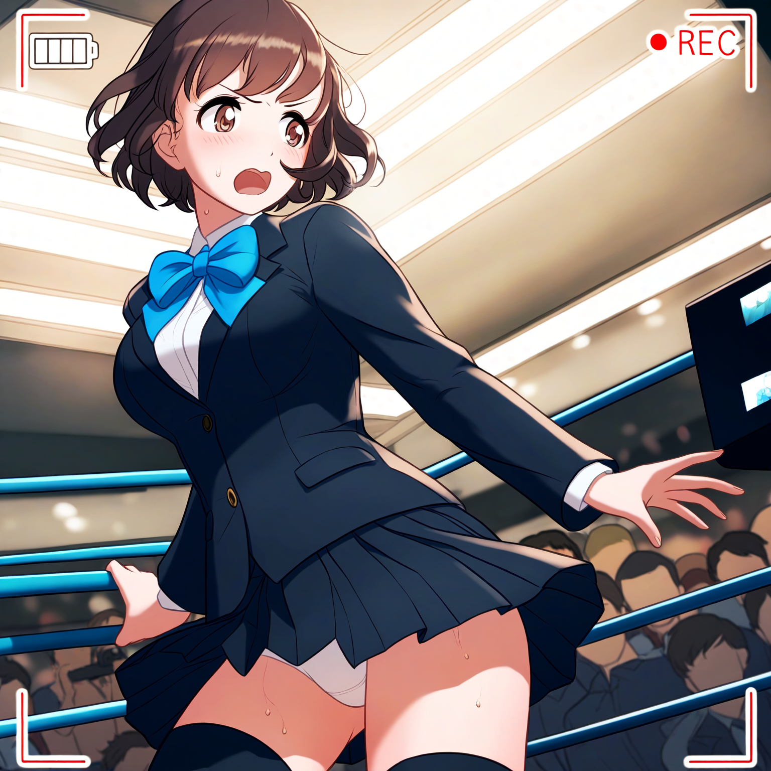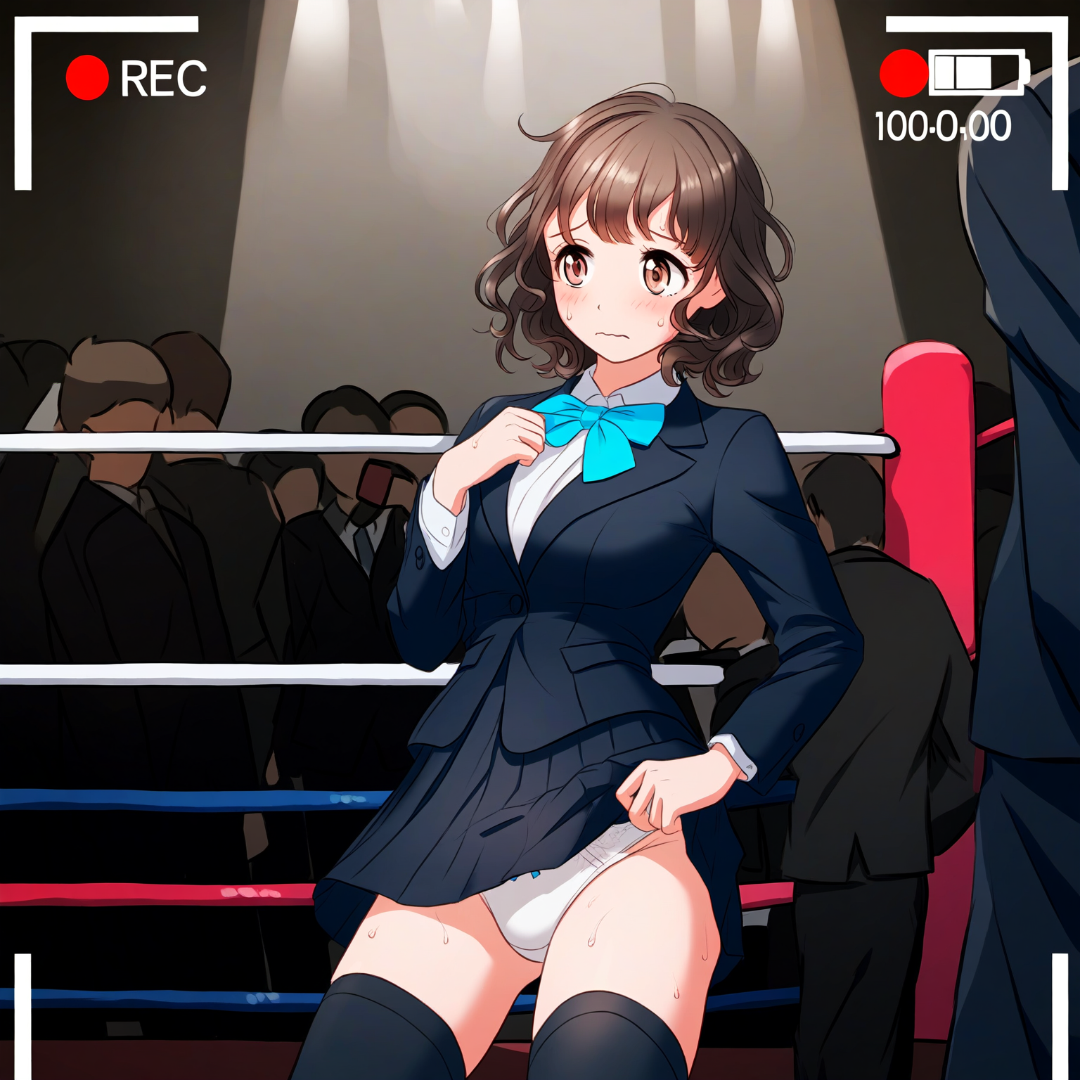 prompt: {game cg},{{{nsfw}}},best quality,1girl and 1 man,brown eyes,{tareme},brown hair,short hair,{{{wavy hair}}},medium breast,black blazer,black skirt,pleated skirt,white panties,looking away,wrestling ring,indoors,embarrassed,group shot,,black thighhighs,hetero,crowd,blue bowtie,{{{recording}}},sweat,{{adjusting panties}},from back, best quality, amazing quality, very aesthetic, absurdres