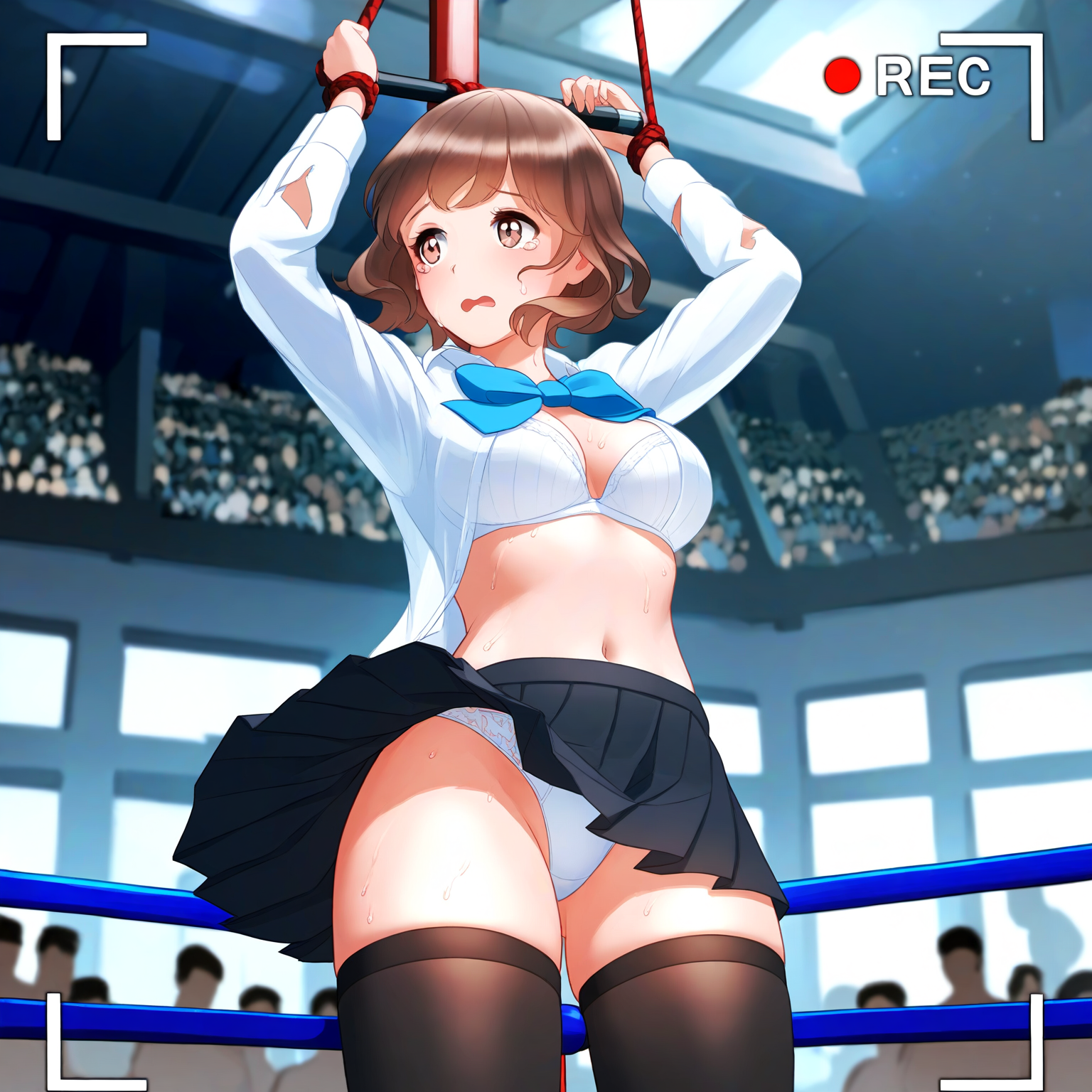 prompt: {game cg},{{{nsfw}}},best quality,1girl ,closed eyes,{tareme},brown hair,short hair,{{{wavy hair}}},medium breast,white shirt,collared,long sleeves,black skirt,pleated skirt,white panties,looking away,wrestling ring,indoors,tears,black thighhighs,lying,blue bowtie,{{{recording}}},sweat,cowboy shot,torn shirt,white bra,blue floor,, best quality, amazing quality, very aesthetic, absurdres