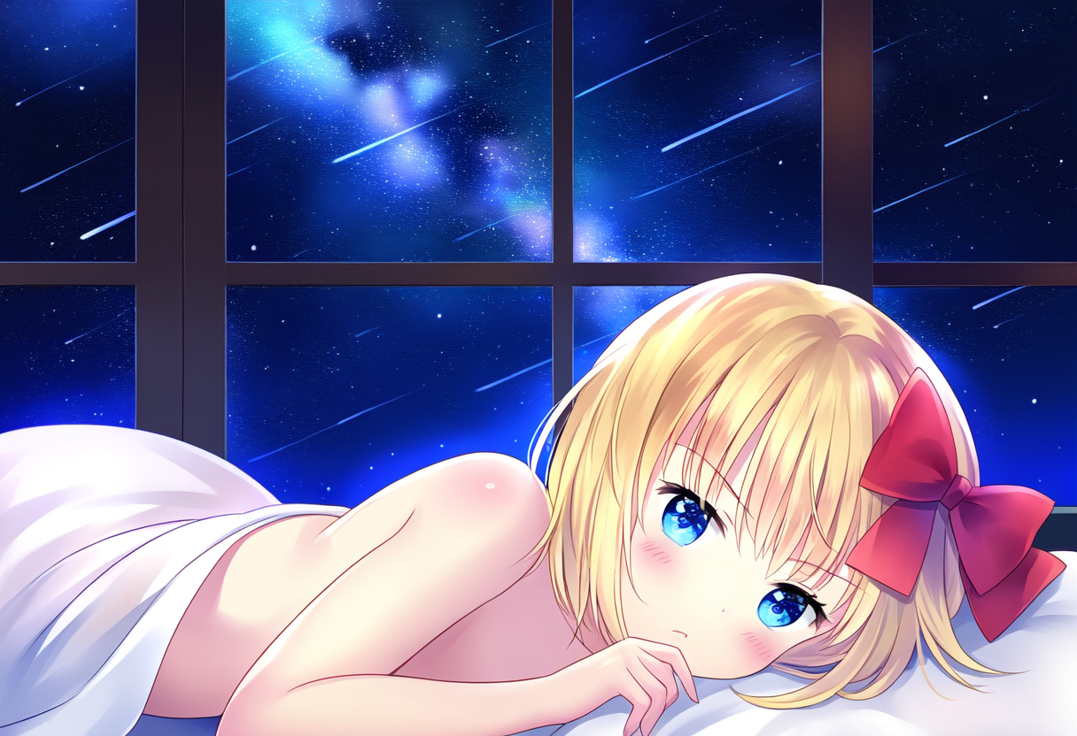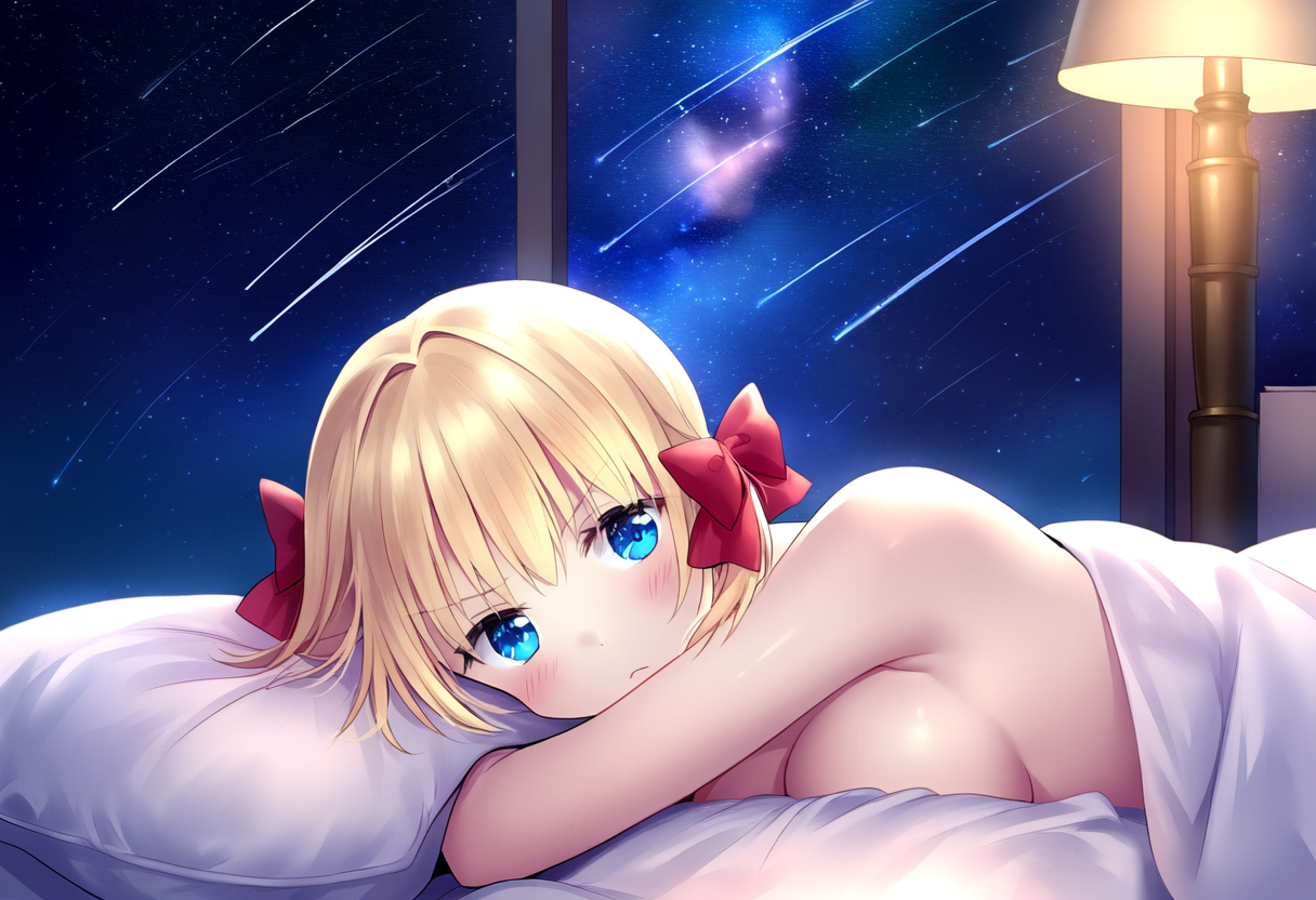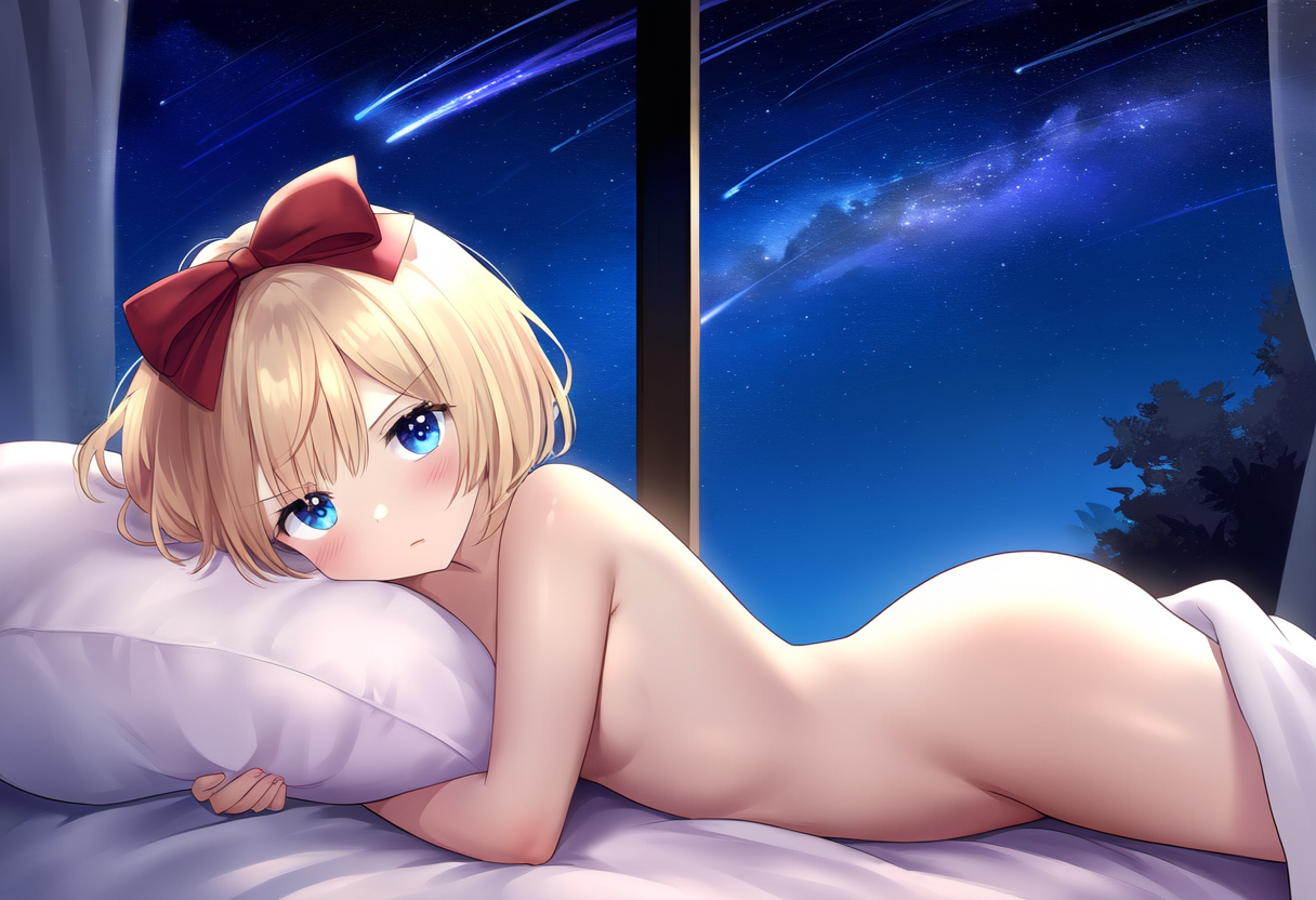 prompt: {{{{nsfw}}}},1girl, girl, short hair, blonde hair, blue eyes, hair bow, red bow, lying down, bedroom, watching shooting stars, window view, night sky, peaceful expression, young, nude,annoyed, comfortable, star gazing, soft bedding, moonlit room, twinkling stars, tranquil night, whimsical atmosphere, shooting stars, gentle breeze, serene, magical moment, (stargazing:1.5), (tranquility:1.3), (wonder:1.2), masterpiece, best quality, very aesthetic, absurdres, best quality, amazing quality, very aesthetic, absurdres
