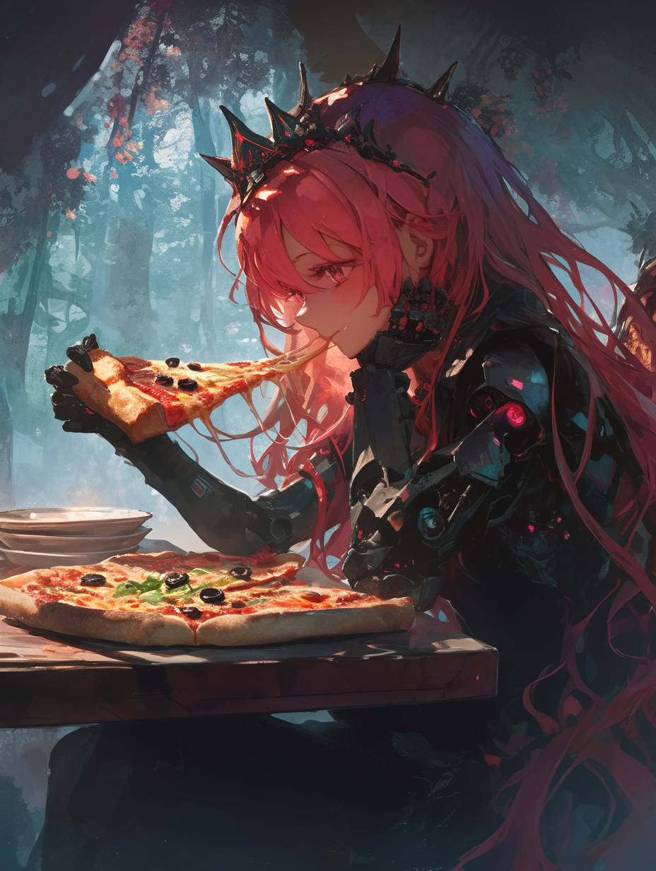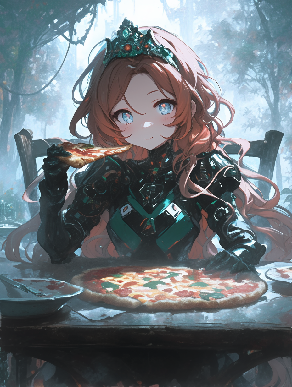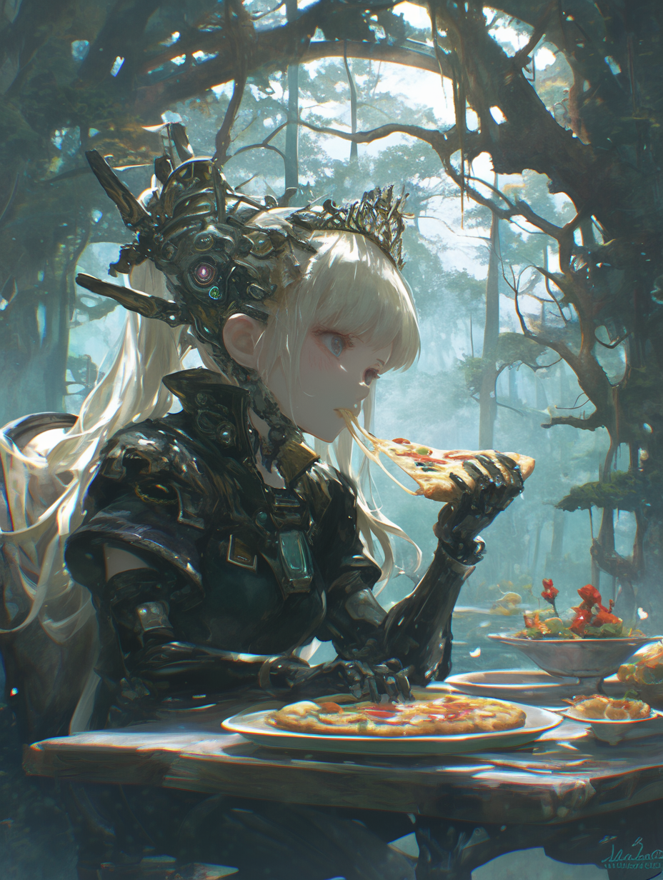 Cyborg princess having pizza for lunch in the forest