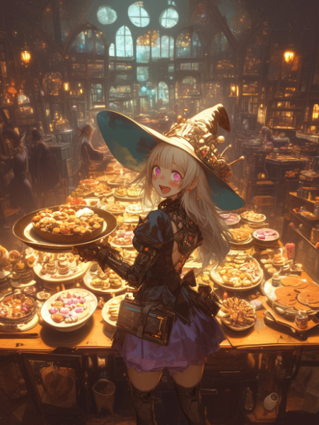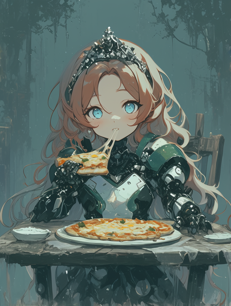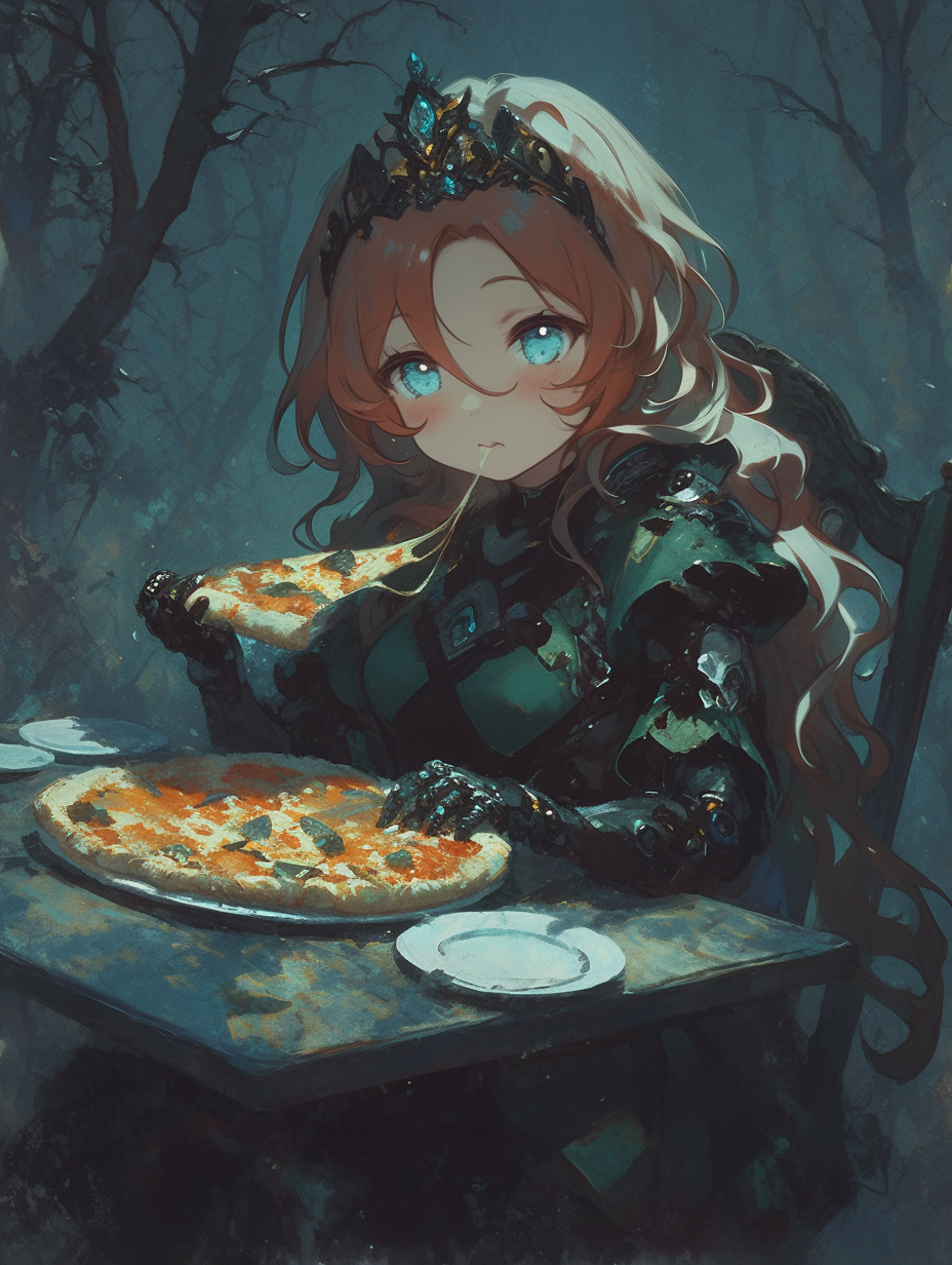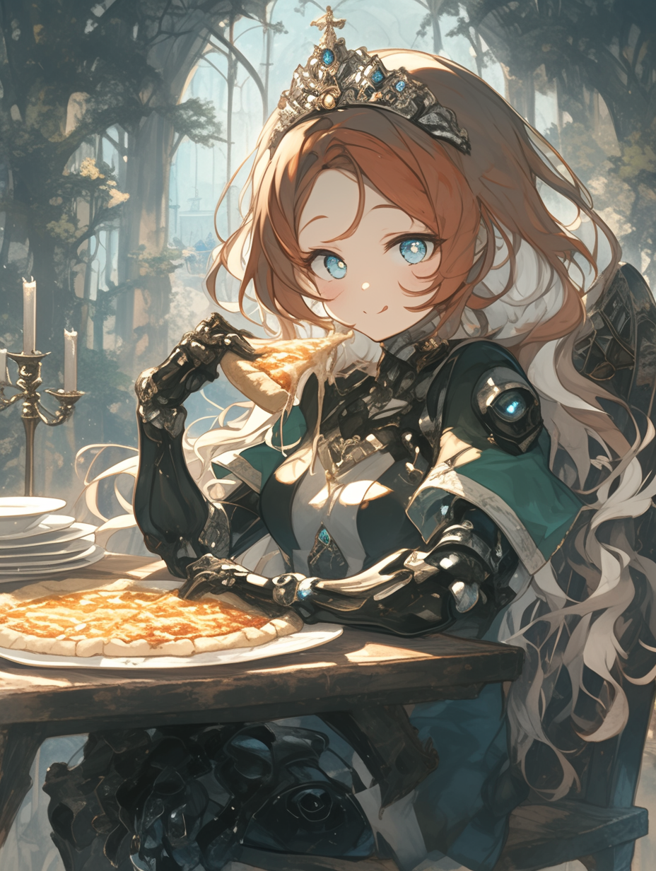 Cyborg princess having pizza for lunch in the forest