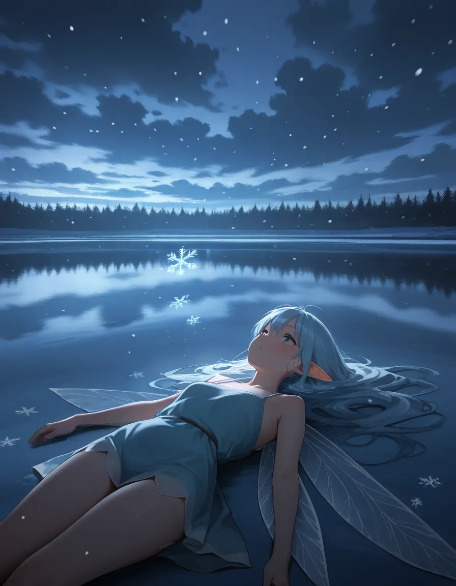 parameters: masterpiece,best quality,amazing quality,(lake:1.5),in winter,night,1girl,(fairy:1.3),light blue hair,horizon,center of the lake,cowboy_shot,(cloudy:1.5),(snowflakes:1.4),snow,(afloat:1.2),on back,dark,snowing,
