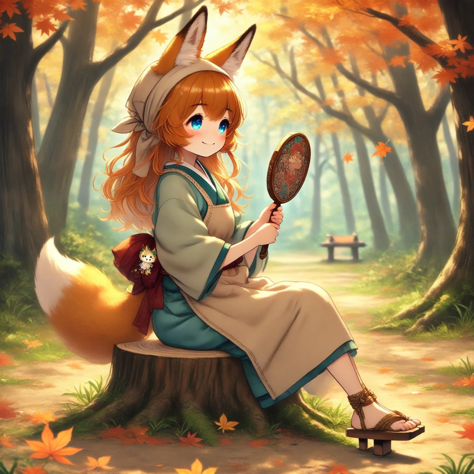 fox girl, fox ears, fox tail, white tip, light brown hair, long hair, bright blue eyes, small breasts, skinny, traditional attire, autumn clothing, indigo-dyed kimono, beige apron, wooden geta sandals, cloth straps, earthy tones headscarf, small fabric pouch, ornate hand mirror, delicate carvings, joyful expression, innocent, sitting on a tree stump, grooming herself, modest lifestyle, cheerful, smile, happy,