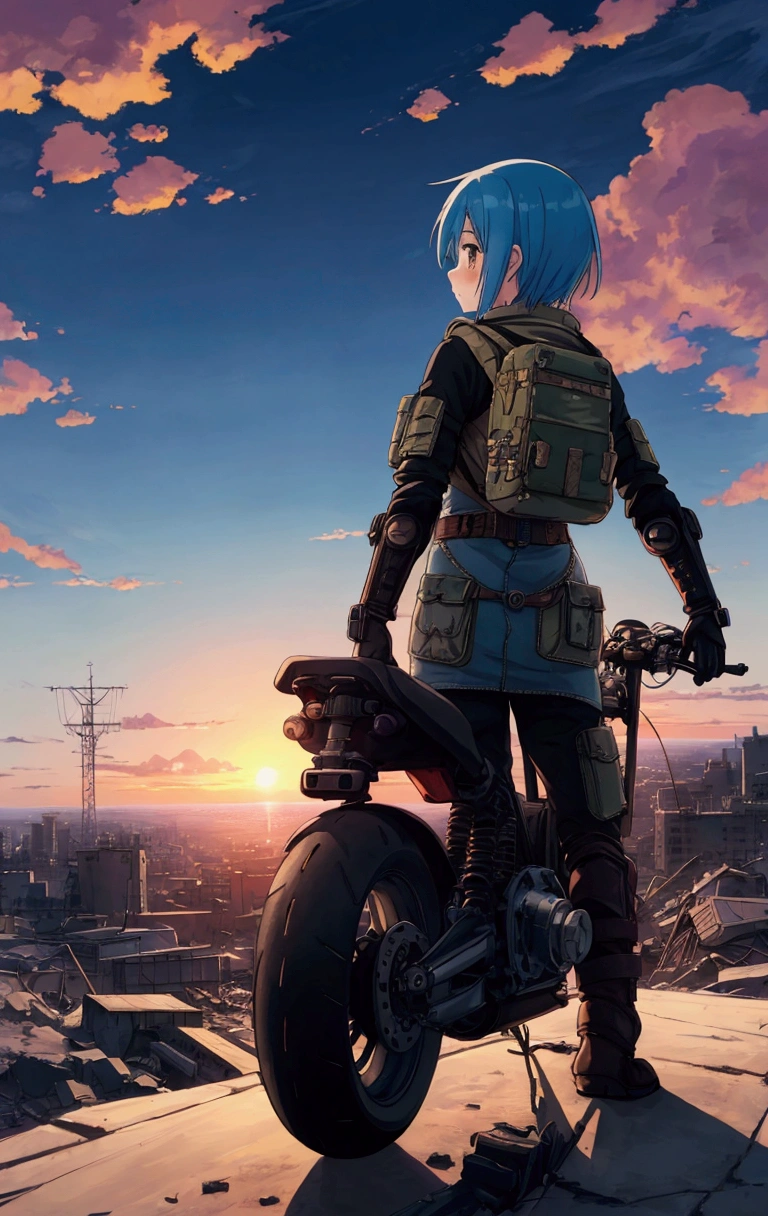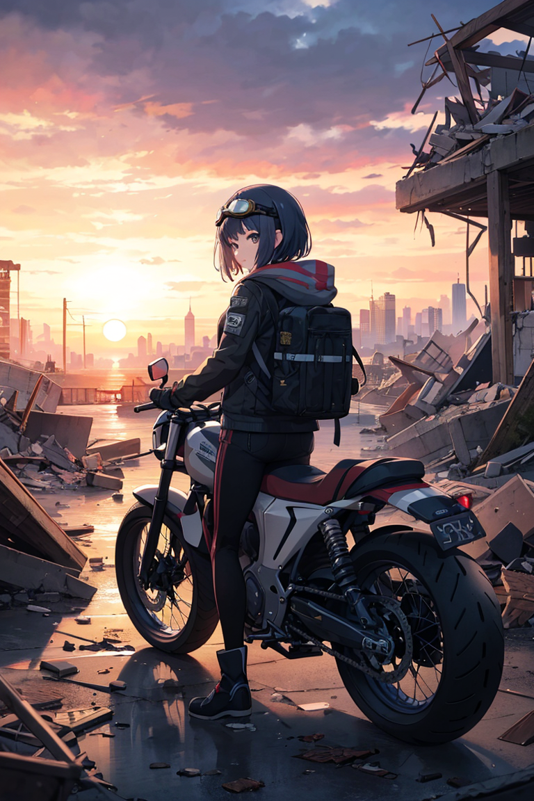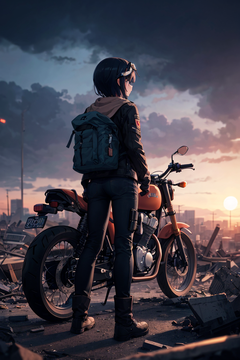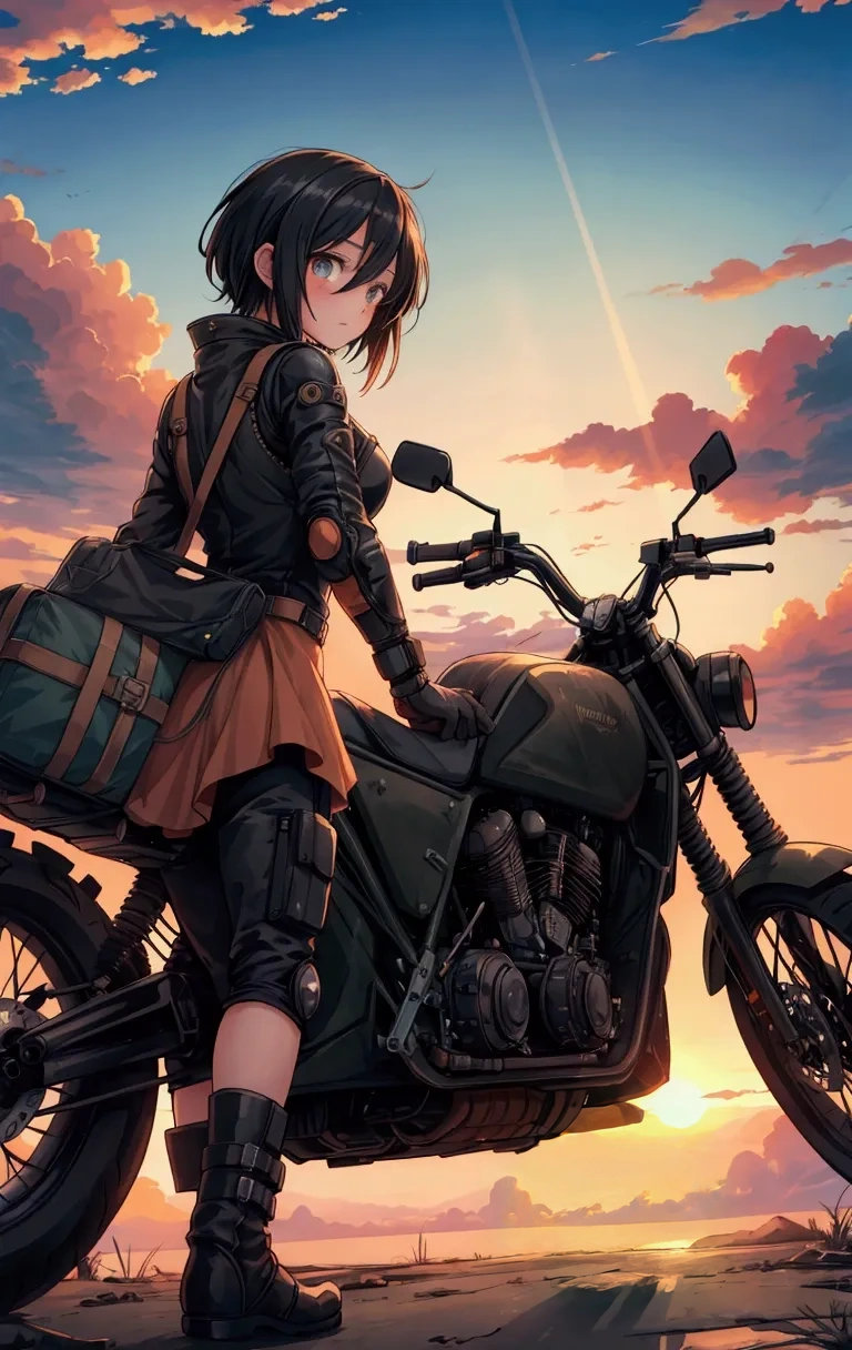 キノの旅かっ! …うん。確かにそれっぽい構図だ(ショートカット黒髪少女とモトラド)