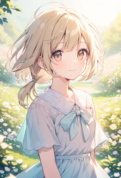 parameters: Thin lines, (Pastel color line drawing: 1.3), (Highest quality illustration: 1.2), (Cute girl: 1.1), (1 girl, solo: 1), (Gentle smile: 0.7), Upper body, Blonde, Short hair, low ponytail, brown eyes, flat chest, spring outfit, sunlight, outdoors, path, flower field, flower blizzard