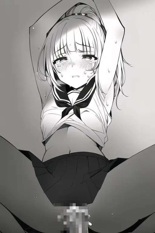 prompt: masterpiece, best quality, nsfw, {hentai doujin, Perspective, cute, detailed}, monochrome, ink, manga, black and white, adorable, delicate features, {hand-drawn, Shading, Gradient}, delicate black ink lines, tonal shading, detailed screentones, realistic body shadows, manga-style, black inking, from below , lens50mm f1.2, 1girl, solo focus, cute around face, cool, beautiful body, {{{school uniform}}}, {mini skirt}, slim tight, {{small breasts}}, navel, [[[[muscular]]]], {groin}, shiny hair, ponytail, blunt bangs, sharp black eyes, {{eyes sparkle, pupils sparkling, {ahegao, crying},beautiful detailed eyes}}, captivating beauty, slender figure, elegant stance, delicate fabric folds, {realistic shading}, lifelike expression, {{high-resolution image}}, simple background, {{delicate wisps of hair, Delicate and intricate lines hair}}, lying, sexy pose, {arms up, armpits},{{{{sex, {{rape}}, public use, {tired}, spread legs, vaginal penis, cum on pussy, groinnether region focus}}}},