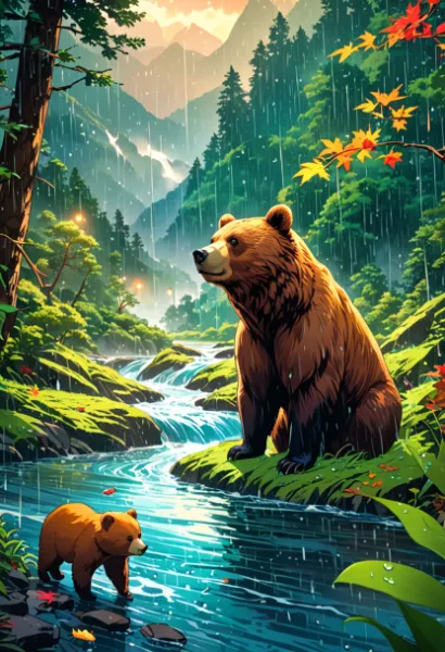 parameters: rain, 8k resolution, masterpiece, best quality, fantasy, dynamic lighting, cinematic lighting, extremely fine and beautiful design, vibrant colors, bear, raindrops, mischief, river, fish, mountain, leaves, fine art, illustration, forest, 森の奥, 雨ふり熊の子, cub, Comic style