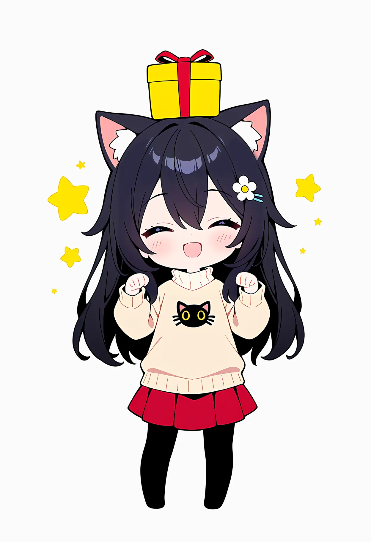 parameters: masterpiece, best quality, very aesthetic, absurdres, flat color, deformed character, chibi, yellow gift box on the head, hands up, 1girl, solo, cute, kawaii, smile, :d, flat chest, cat ears, turtleneck sweater, red skirt, pantyhose, black cat print, flower hairpin, (black hair), long hair, hair between eyes, closed eyes, (white background), star, standing, looking at viewer, full body, <lora:flat_sdxl:-0.5>, <lora:bold-16oa:-0.5>, <lora:Trained20241116-1:0.4>