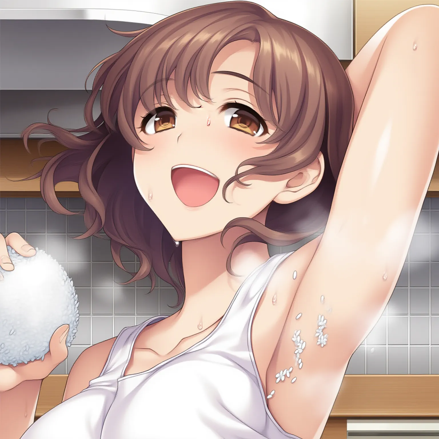 Description: {2020s game cg},best quality,very aesthetic,highly finished,1girl,brown eyes,{tareme},brown hair,short hair,{{{wavy hair}}},medium breast,white tanktop shirt,open mouth,steam,one arm up,armpit,holding white riceball,sweat,smile,white riceball at armpit,one hand at armpit,{shaded eyes},kitchen,portrait, rating:general, best quality, very aesthetic, absurdres