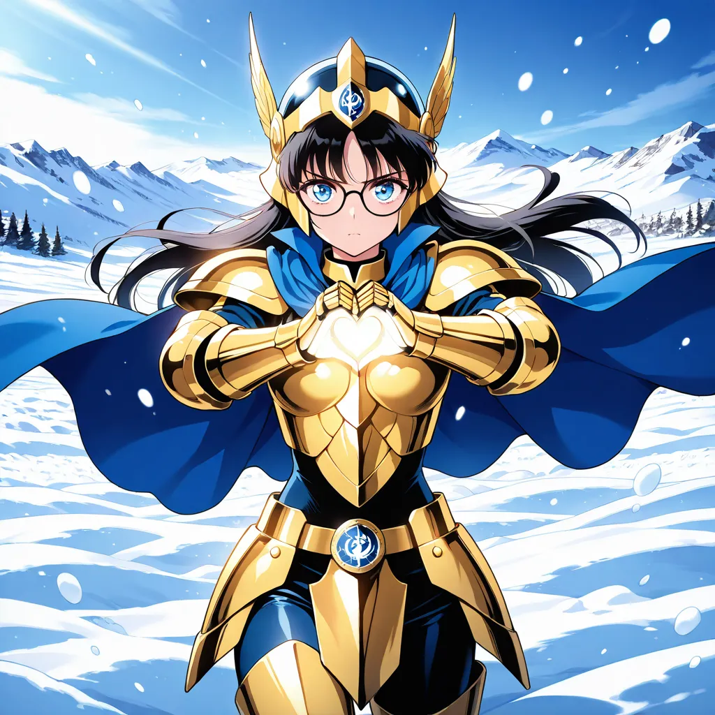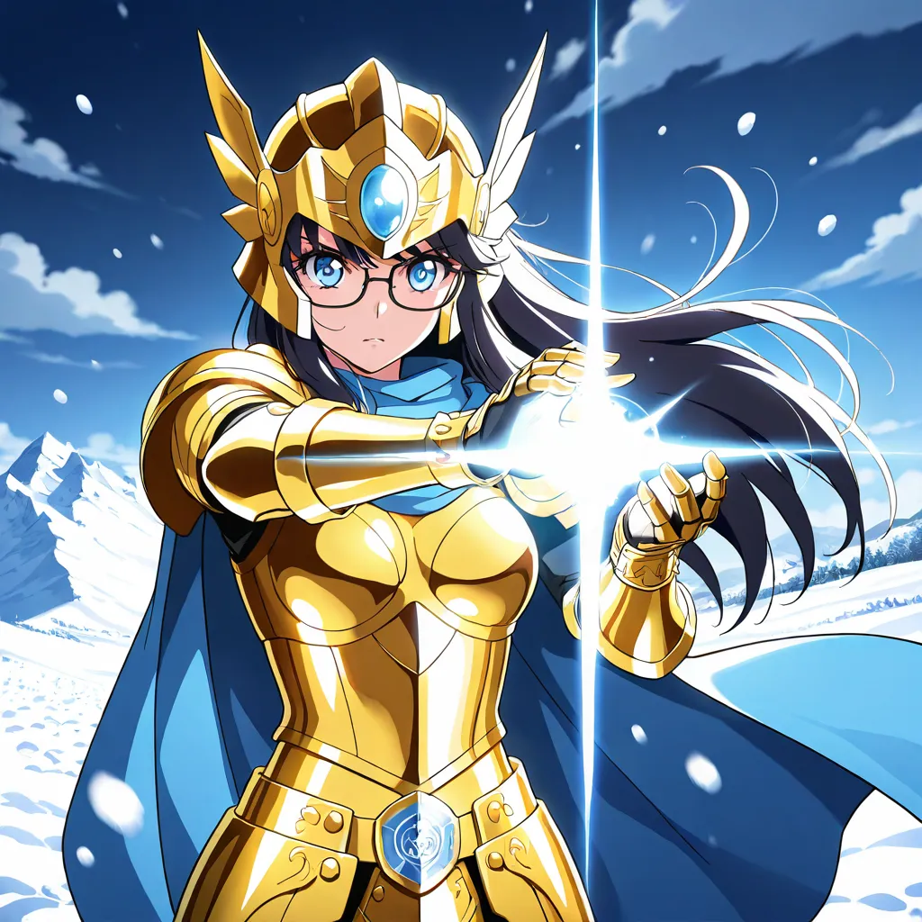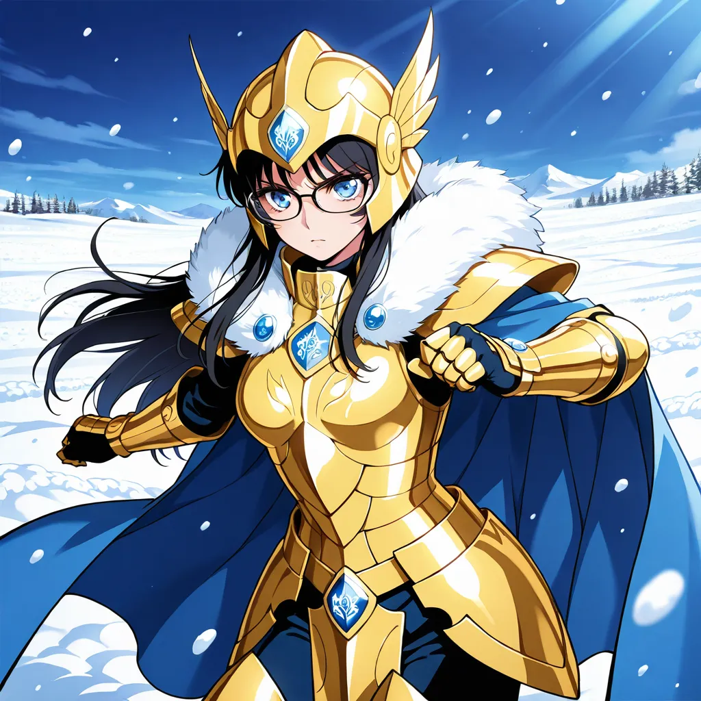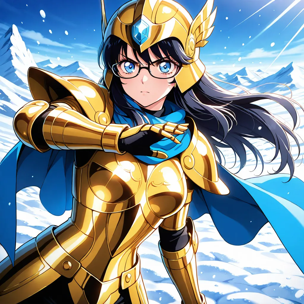 parameters: ((masterpiece)), ((best quality)), (ultra-detailed), ((kawaii)), cute, (lovely), animated style illustration, (Snowfield in a heavy blizzard:1.9), (in the midst of a heavy snow blizzard:1.6), 1girl, cute girl, solo, (beautiful blue eyes), (glasses:1.3), (beautiful black hair:1.5), (long hair:1.3), slim, slender, medium breast, Scorpio gold saint armor, female character, wearing golden armor, ornate details, (glowing scorpion symbol), serious expression, fantasy armor, intricate design, cosmic glow, Saint Seiya style, (dynamic pose:1.2), (spiked gauntlets), (helmet with scorpion motif:1.3), detailed shading, shining light effects, (action pose:1.3), standing proudly, dramatic lighting, (Golden armor covering most of the body:1.3), (Metallic luster:1.7), (Blue cape fluttering in the wind:1.4), (blizzard effect:1.3).