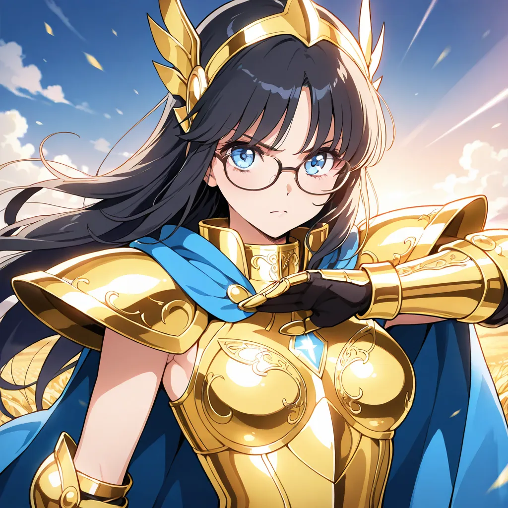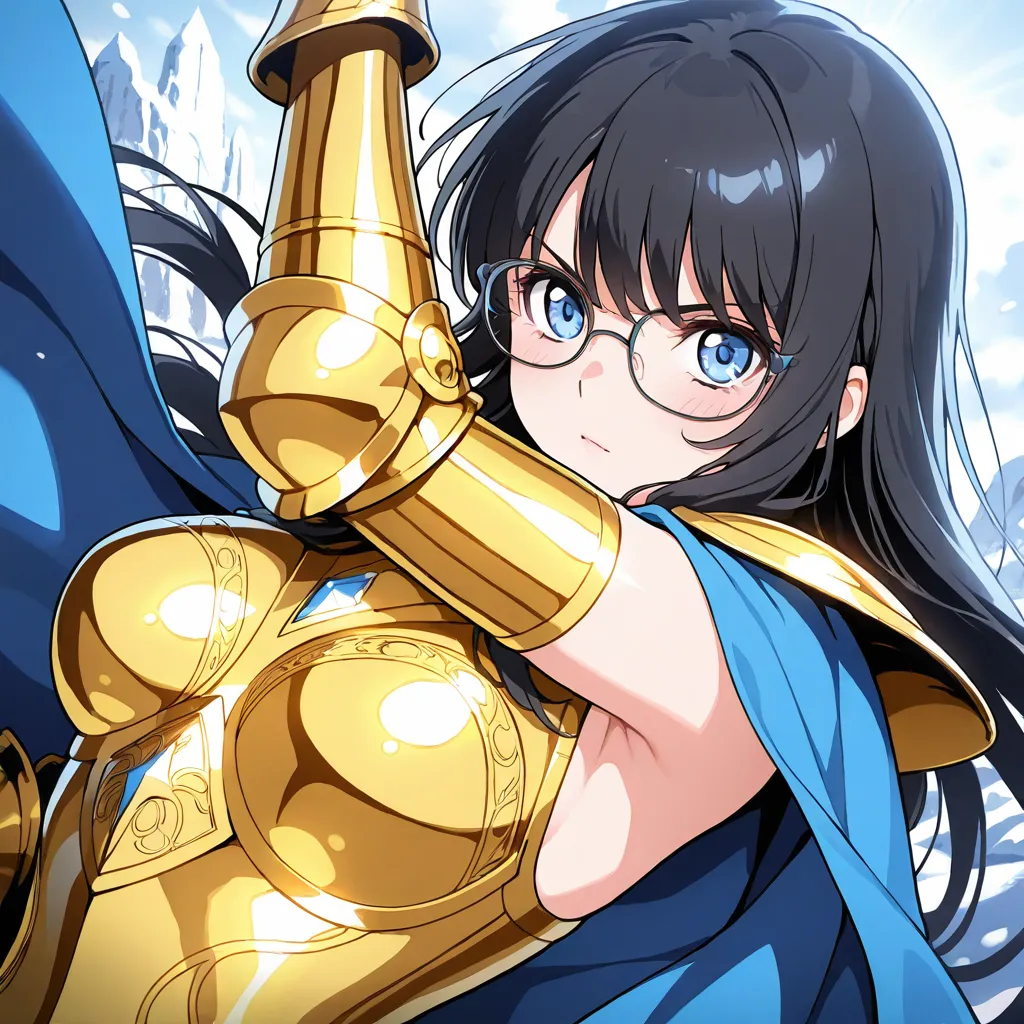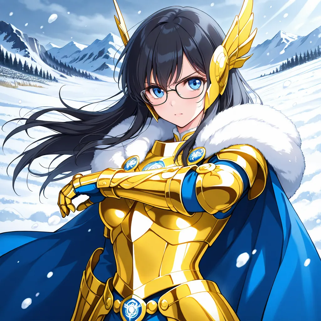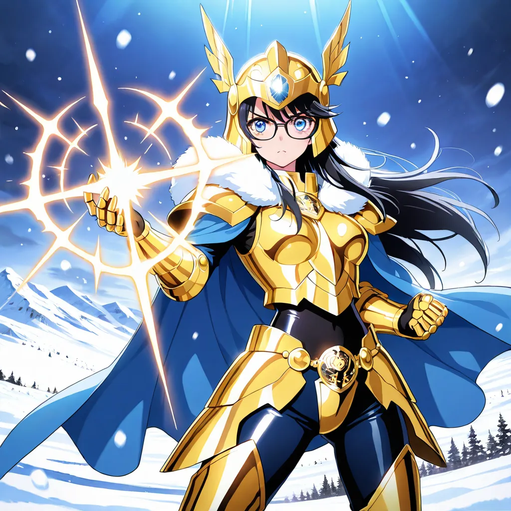 parameters: ((masterpiece)), ((best quality)), (ultra-detailed), ((kawaii)), cute, (lovely), animated style illustration, (Snowfield in a heavy blizzard:1.9), (in the midst of a heavy snow blizzard:1.6), 1girl, cute girl, solo, (beautiful blue eyes), (glasses:1.3), (beautiful black hair:1.5), (long hair:1.3), slim, slender, medium breast, Scorpio gold saint armor, female character, wearing golden armor, ornate details, (glowing scorpion symbol), serious expression, fantasy armor, intricate design, cosmic glow, Saint Seiya style, (dynamic pose:1.2), (spiked gauntlets), (helmet with scorpion motif:1.3), detailed shading, shining light effects, (action pose:1.3), standing proudly, dramatic lighting, (Golden armor covering most of the body:1.3), (Metallic luster:1.7), (Blue cape fluttering in the wind:1.4), (blizzard effect:1.3).