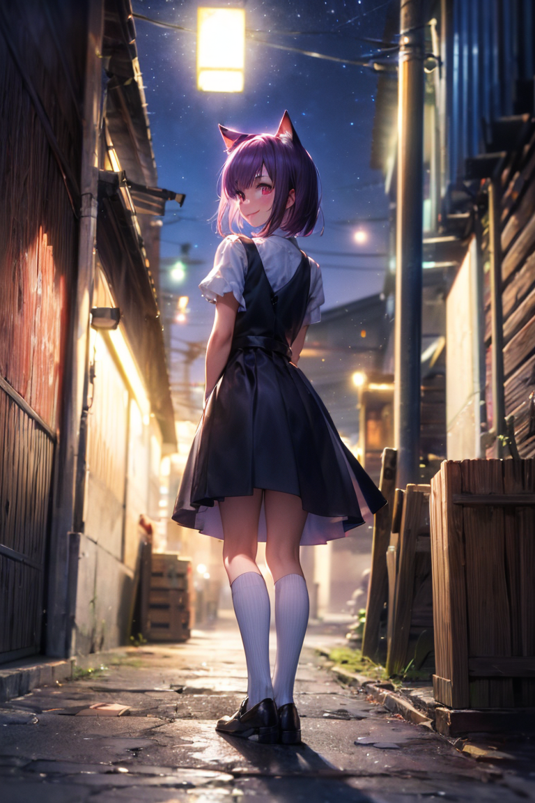 parameters: masterpiece, best quality, extremely detailed, anime, full boy shot, a woman, purple hair, bobcut, blunt bangs, red hair ribbon, cat ears, yellow glowing eyes, cat eyes, smile, (bright red colored pinafore dress), white blouse, standing, white socks, leather loafers, Showa Era, showa retro, sad lonely back alley, wooden telephone pole, wooden wall, night, night sky, darkness, pitch black road, streetlight, back alley, horror <lora:yawanuri:1> <lora:hairdetailer:1>