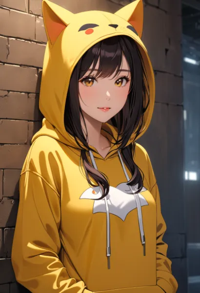 parameters: ((best quality)), ((Masterpiece)), (detailed),1woman, in Yellow cat hoodie,front printed ,in front of a wall,8k 、high resolution, dynamic production,cinematic lighting, <lora:geometric_shapes:1> <lora:lightline:1>