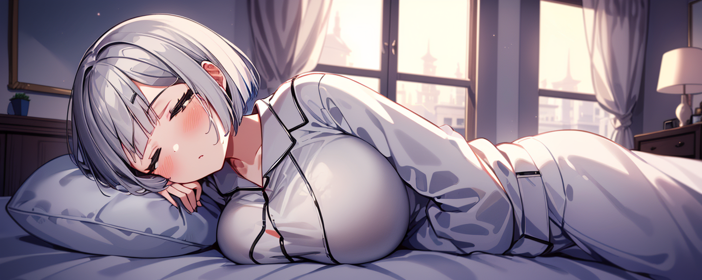parameters: 1girl,High girls, large breasts, ((silver bob,grey pupils)),pajamas,sleeping,In the blanket,(HDR,UHD,8K,best quality,masterpiece),very aesthetic, absurdres,colorful,bedroom