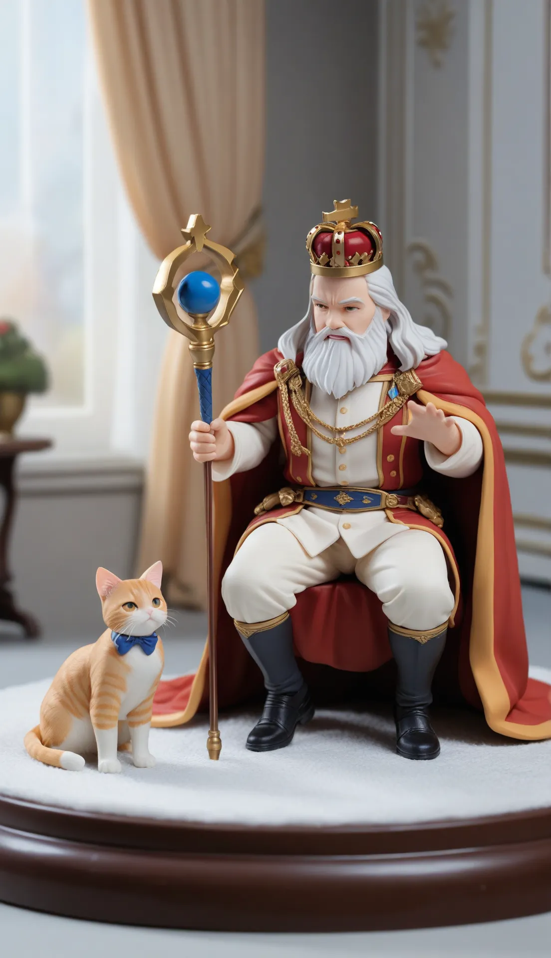 parameters: king, King's staff, beard, crown, regal, curtains, masterpiece, best quality, miniature model type, miniature scenery,