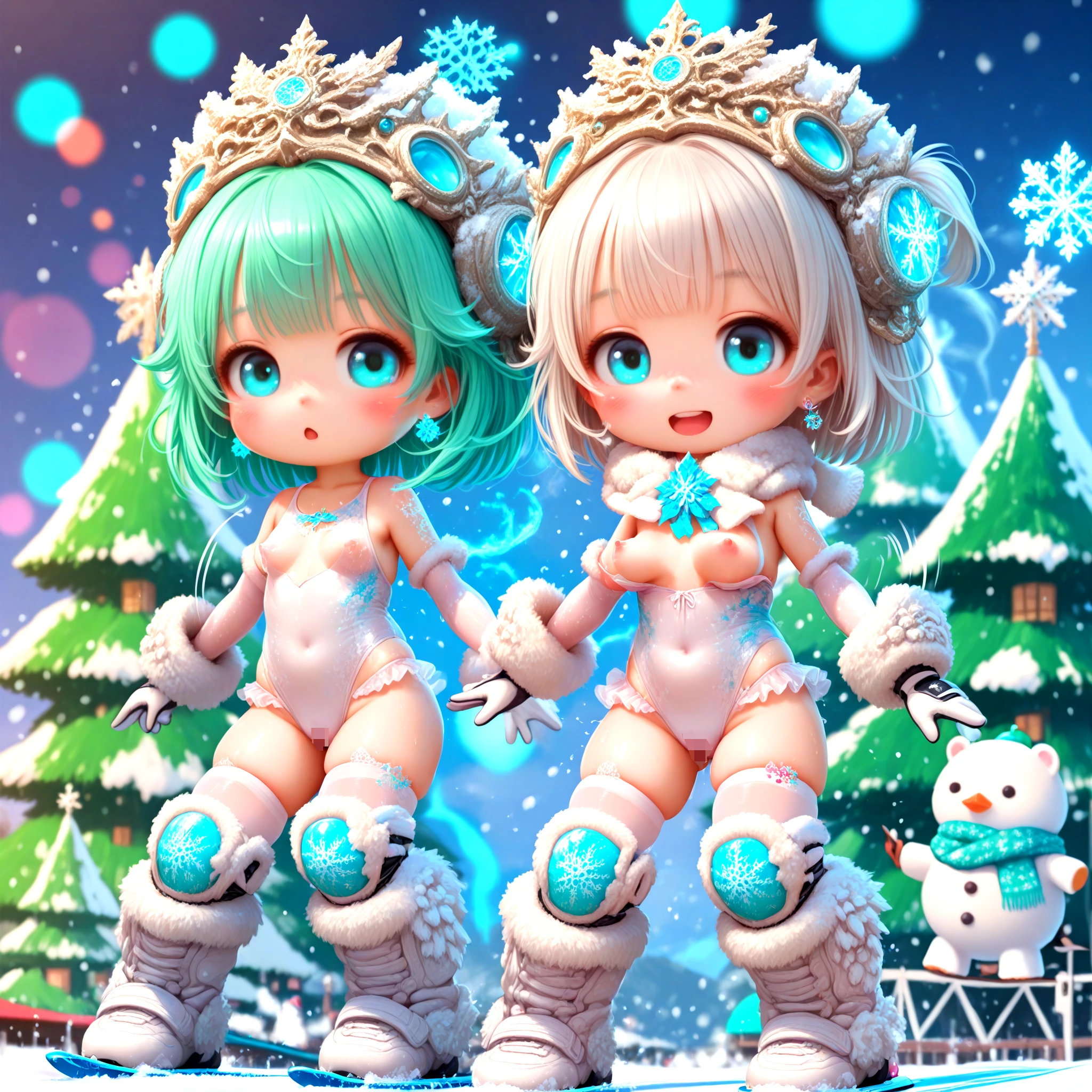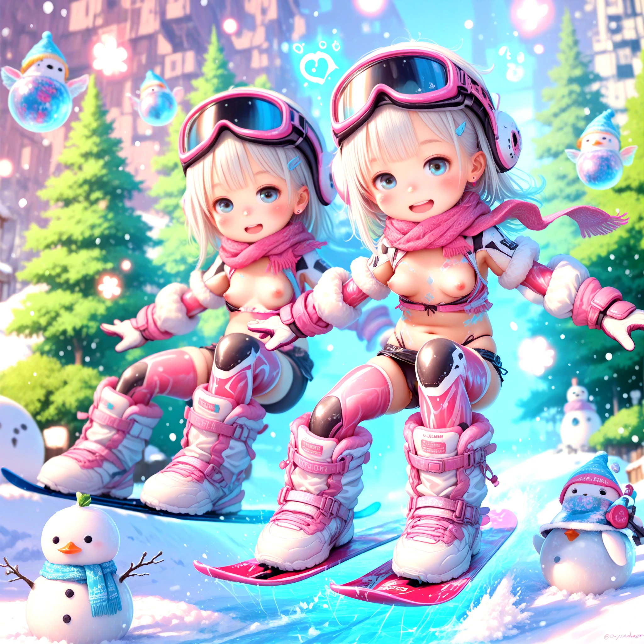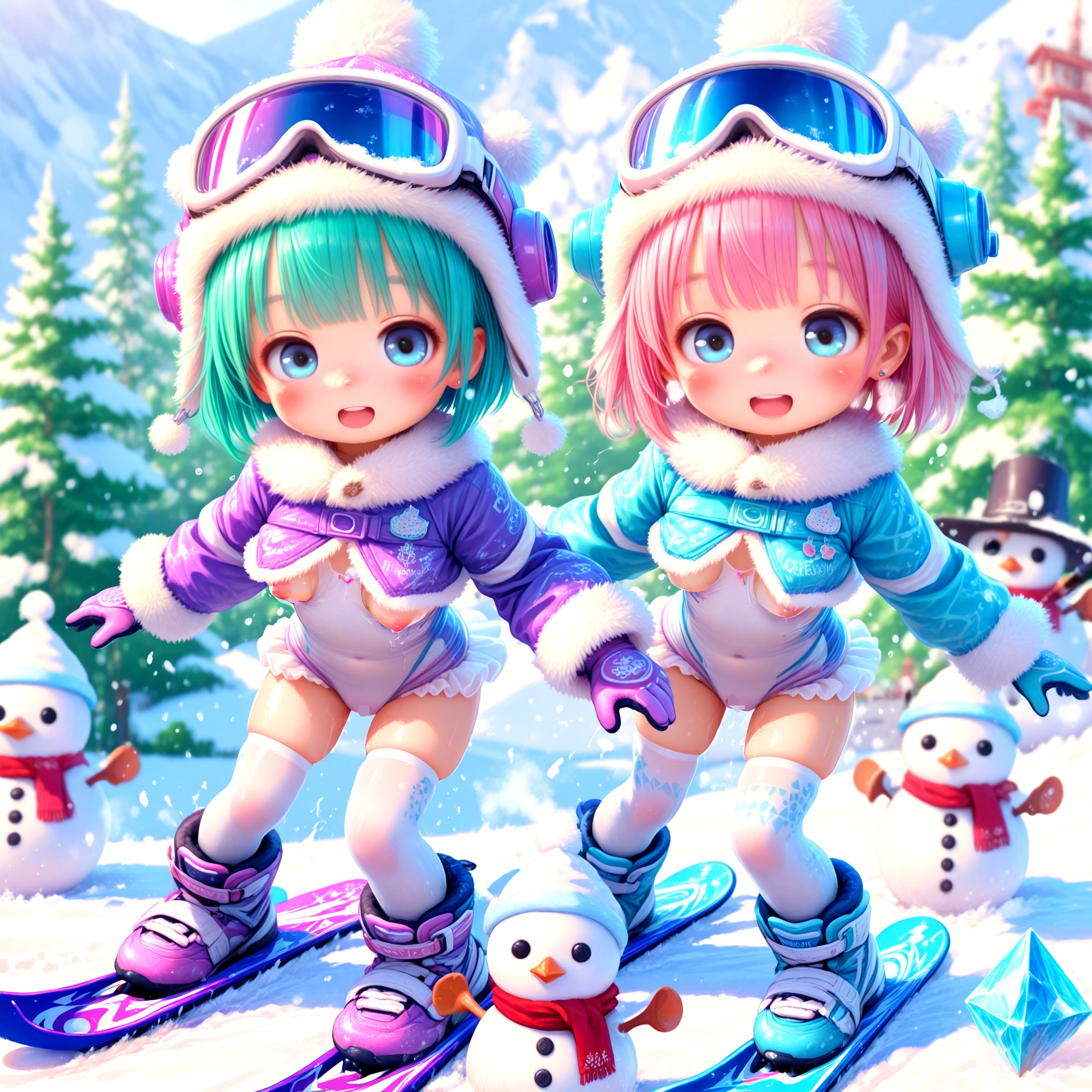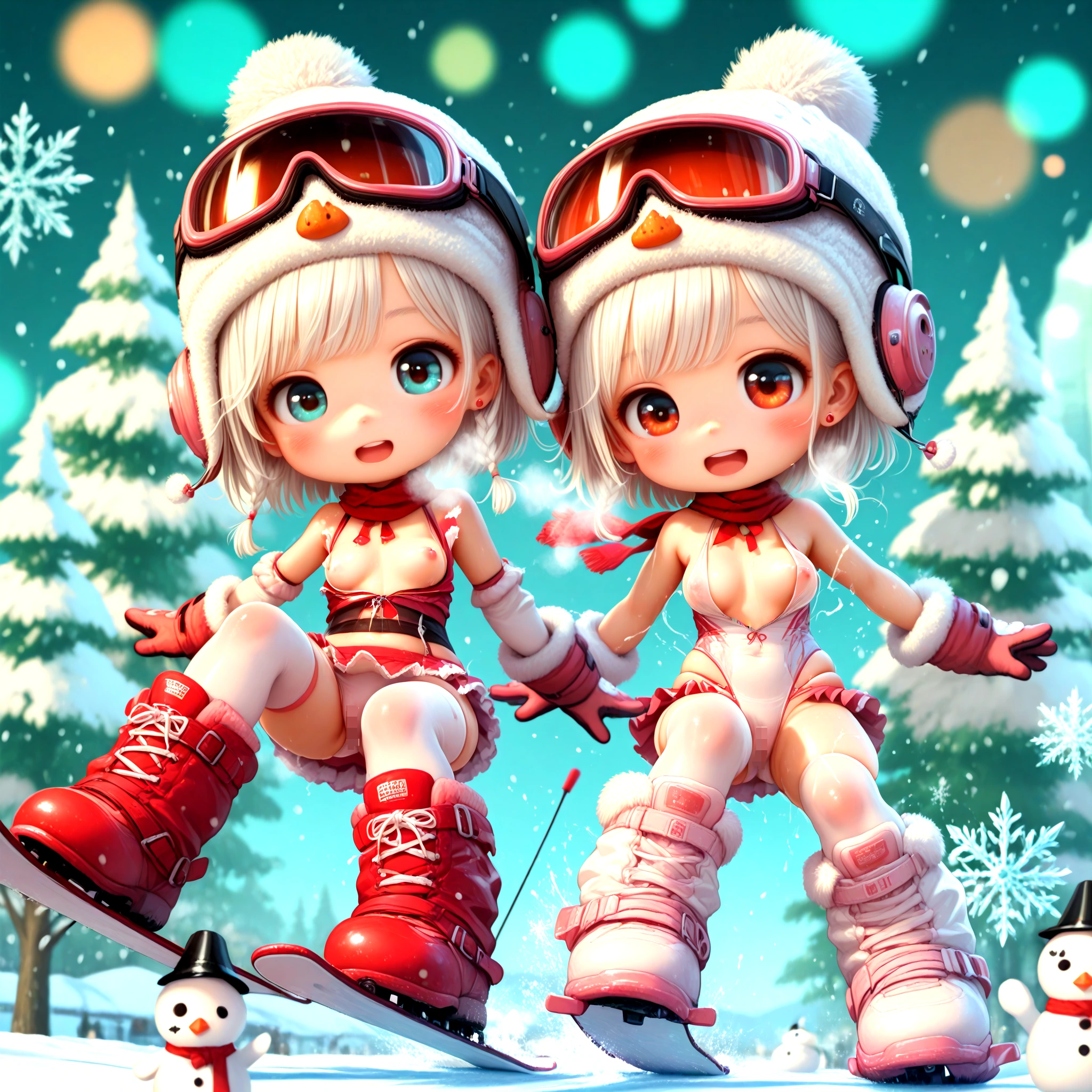 1girl, sexy loli, toddler, avalanche skiing acrobatics, snowboarding, (magical gloves, Copper cyber ski wear, center_opening, micro skirt, motion lines), scarf, red spinel heavy fringe long hair, oily flesh skin, sparkling big pupils, stud threader earrings