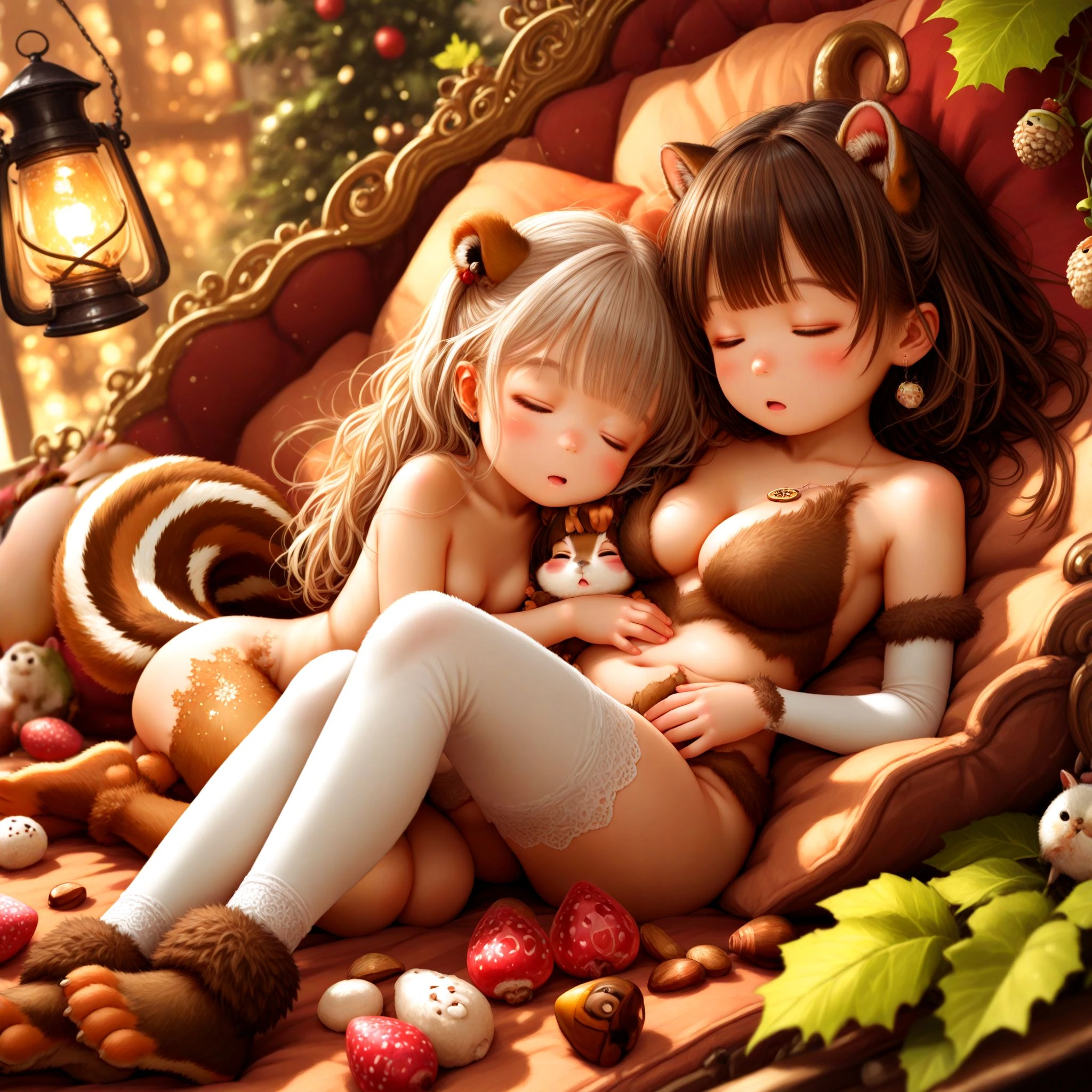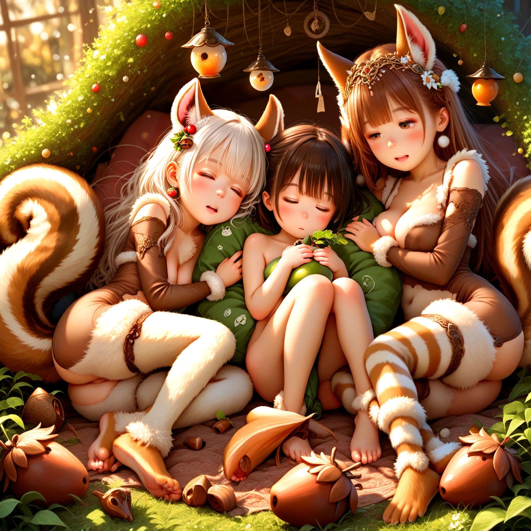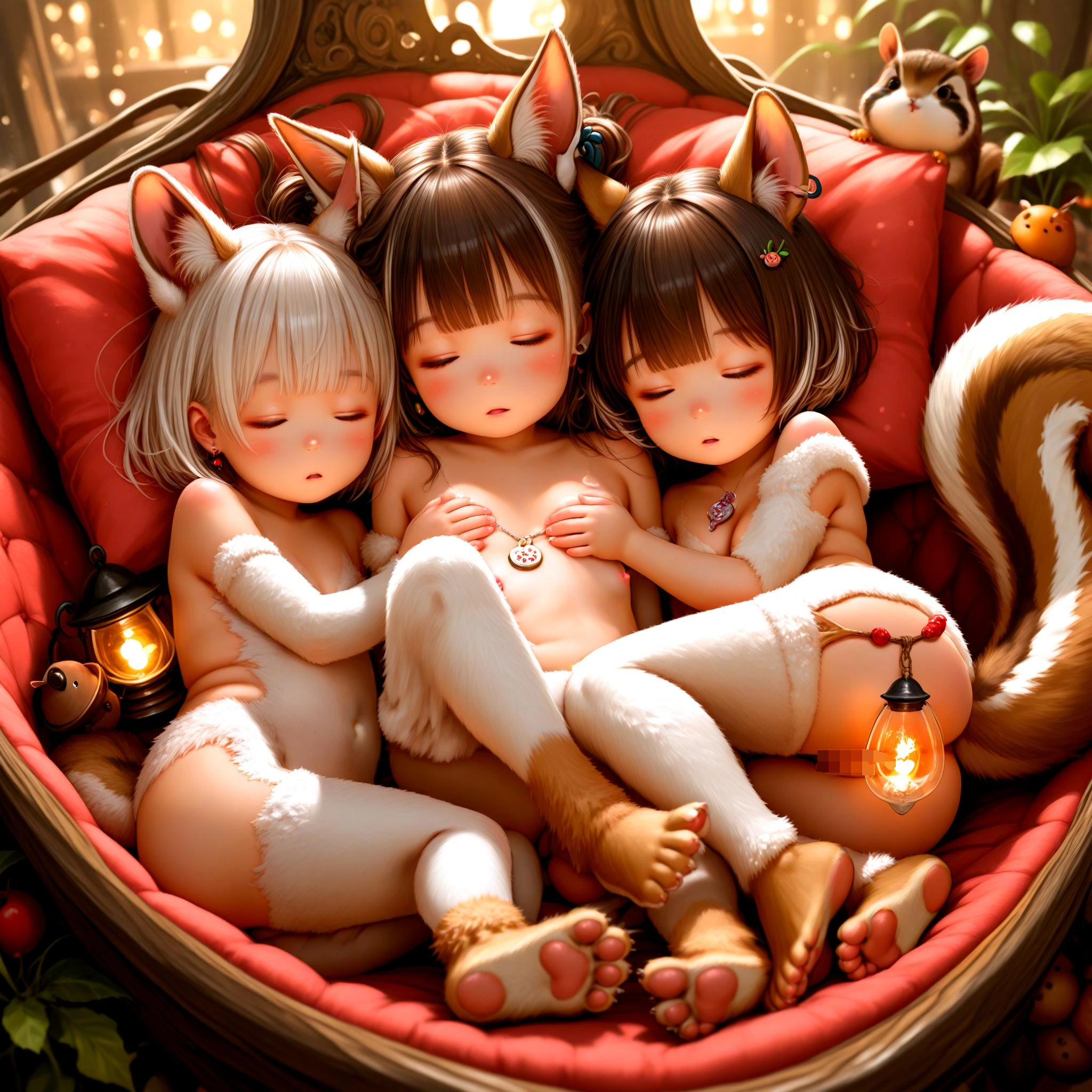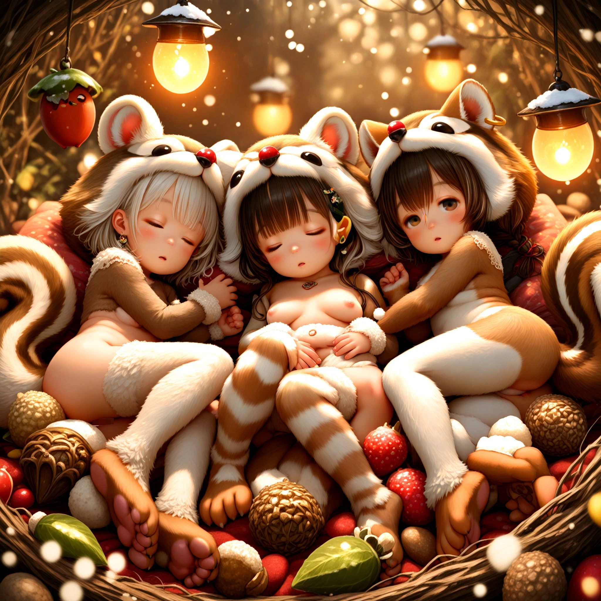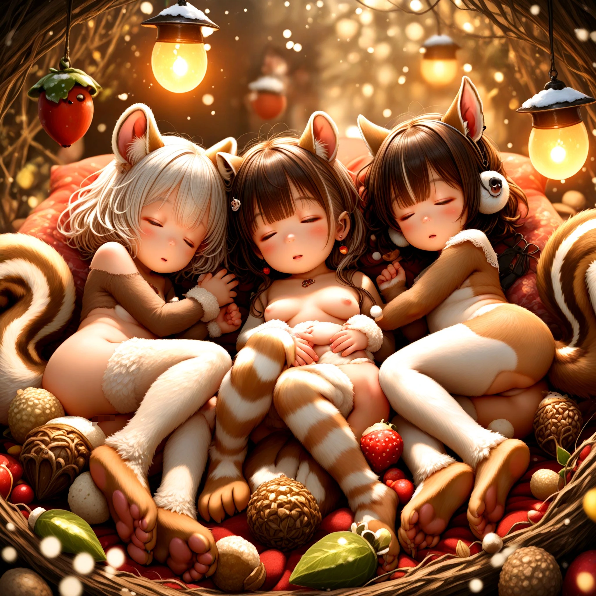 1girl, cute loli, toddlercon, sleeping happy in Cave of fallen leaves, naked, (body fur, fur body suits, bear fur feet, bear ears, bear tail:1.2), fringed bangs prom hairstyle, flesh skin, skimpy, stud long earrings, eye closing