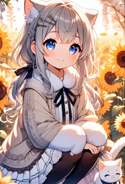 parameters: (Beautiful detail), (Super detail), (Detail), (High resolution), (Girl, 10 years old, Lolita, Cute, Solo), (Masterpiece), (Top quality), (Detail), Fluffy hair, Gray hair, Long hair, Twintails, Ribbon, Hairpin, Cute winter clothes, Blush, Smile, Joy, Happiness, (White cat head), Coat, Downtown, Coffee,