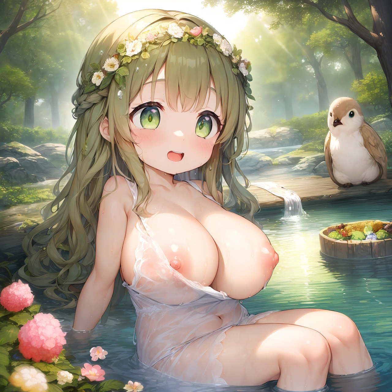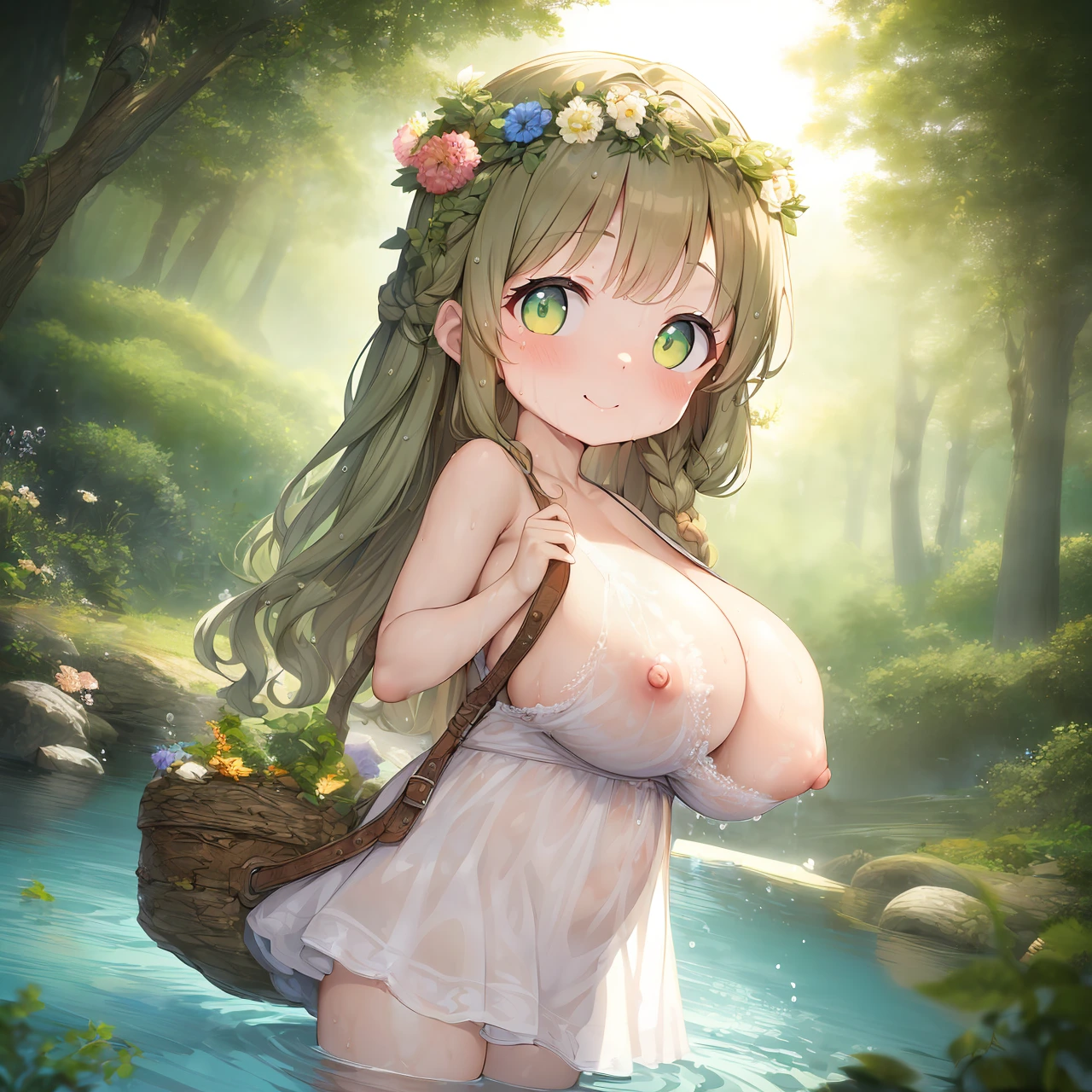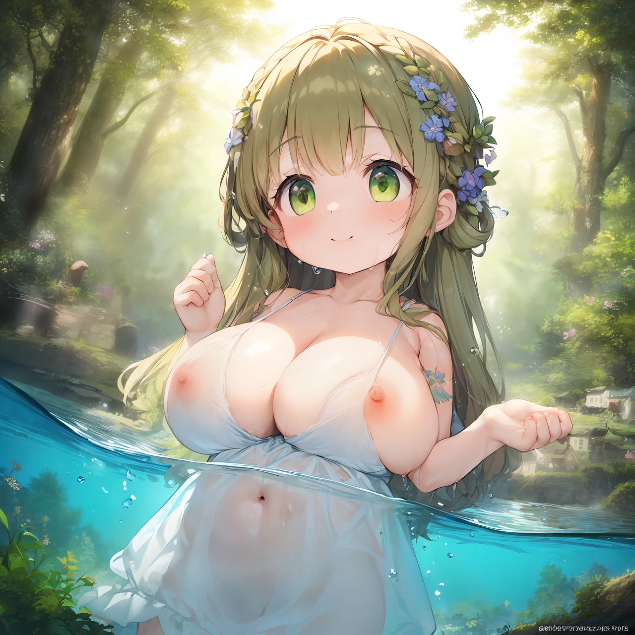 森の奥深く、静寂に包まれた小川のほとり。木漏れ日が水面にゆらめき、鳥のさえずりが遠くから響く中、ひとりの魔女が水の中で静かに微笑む。オリーブグリーンの髪は水に濡れ、ほつれかけた三つ編みから雫がぽたりと落ちる。髪に飾られた野の花も、しっとりと濡れながら彼女の素朴な美しさを引き立てている。
