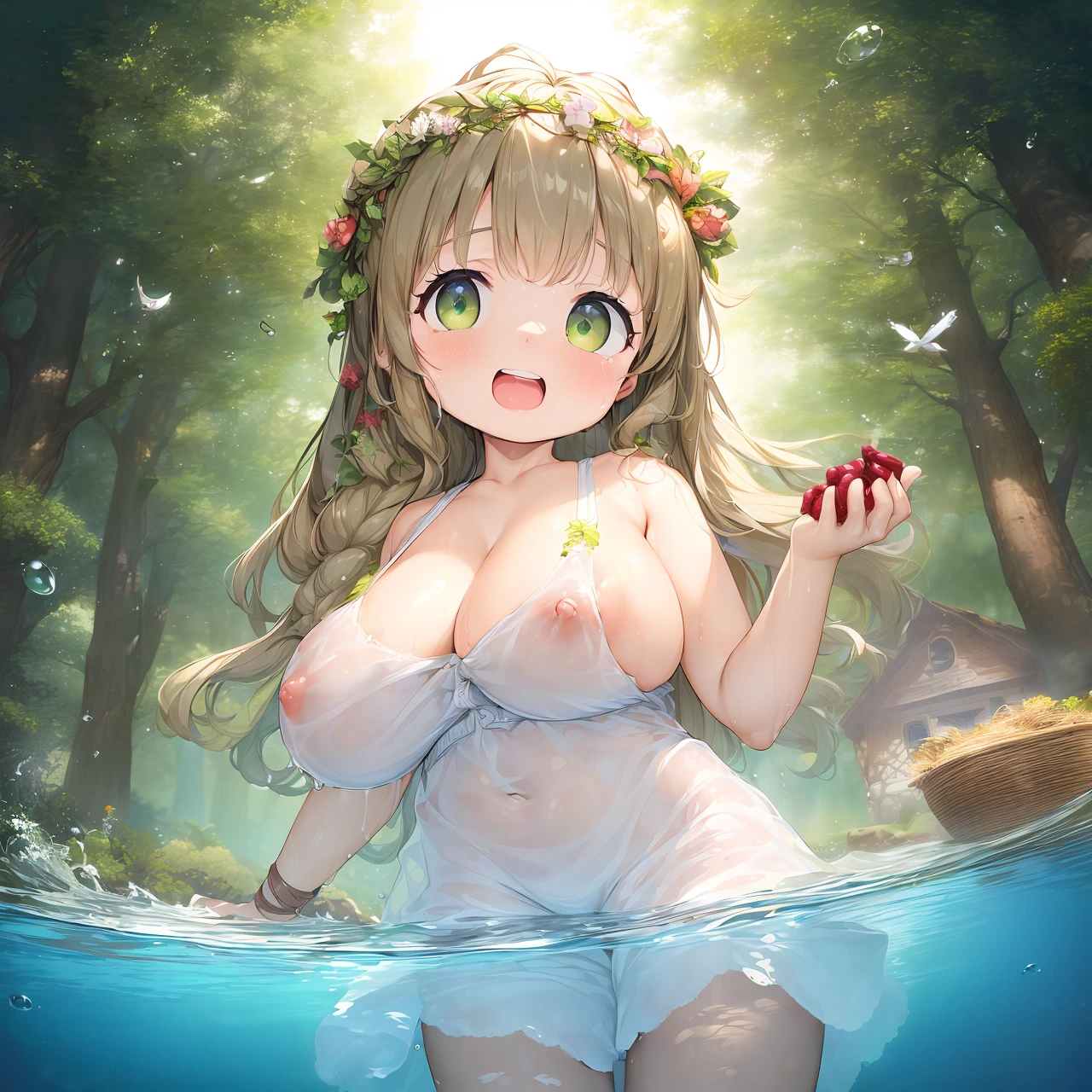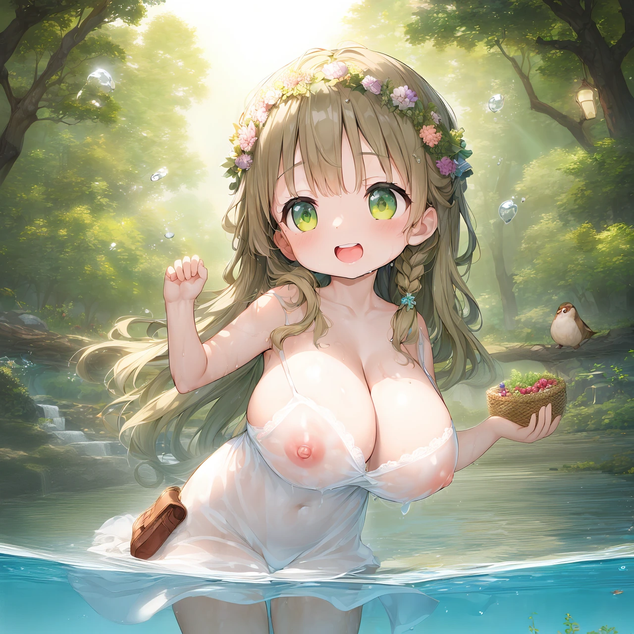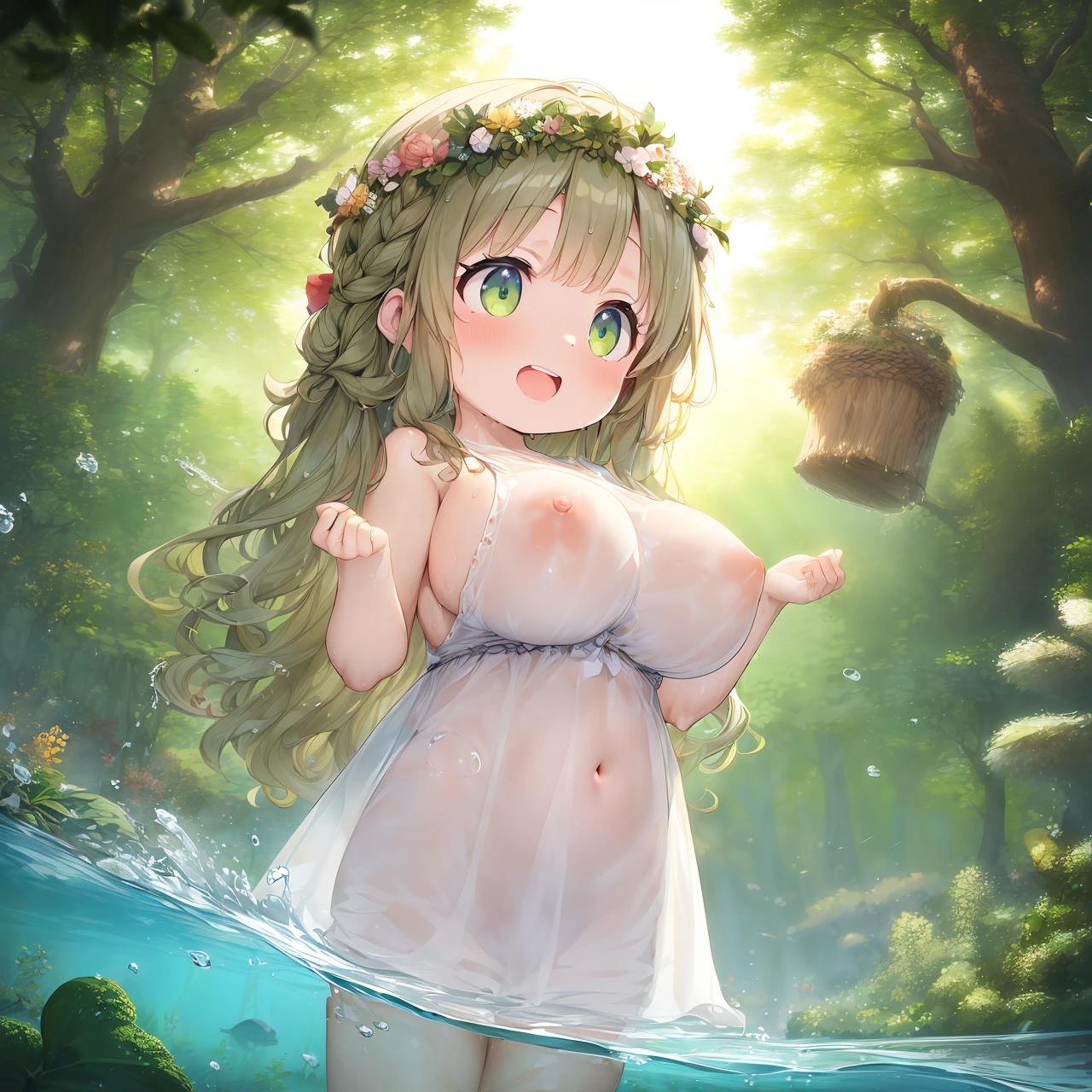 ハーブグリーンの瞳は、川面に映る光に照らされて金色の輝きを宿し、見る者の心をそっと癒す。濡れた白いキャミソールワンピースは身体に優しく寄り添い、肩紐が少しずり落ちた姿が、どこか無防備で自然体。頬をわずかに紅潮させながら、彼女は涼しげに水をすくい、ふふっと楽しげに笑う。