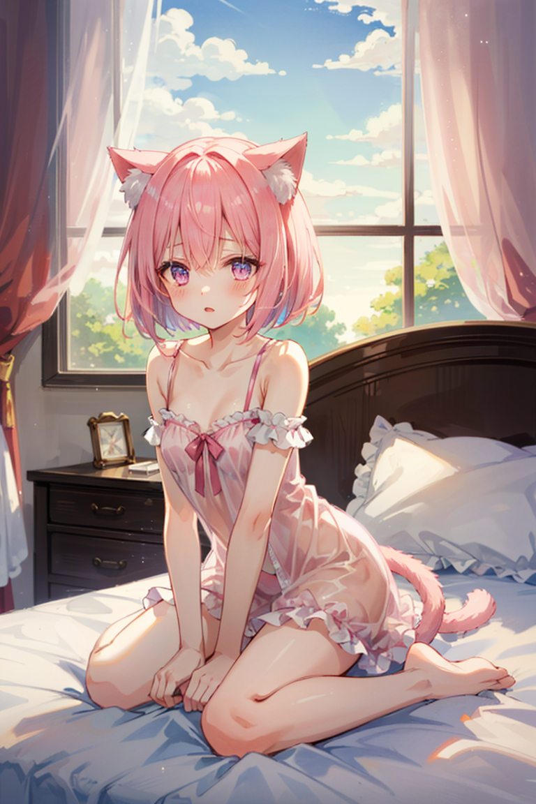parameters: cat ears, pink hair, bouncy hair, bob cut, purple cat eyes, tomboy, adult female, fantasy costume, pink tail, short negligee with pink frills, on the bed, just woke up, fantasy bedroom, sleepy face, morning sun