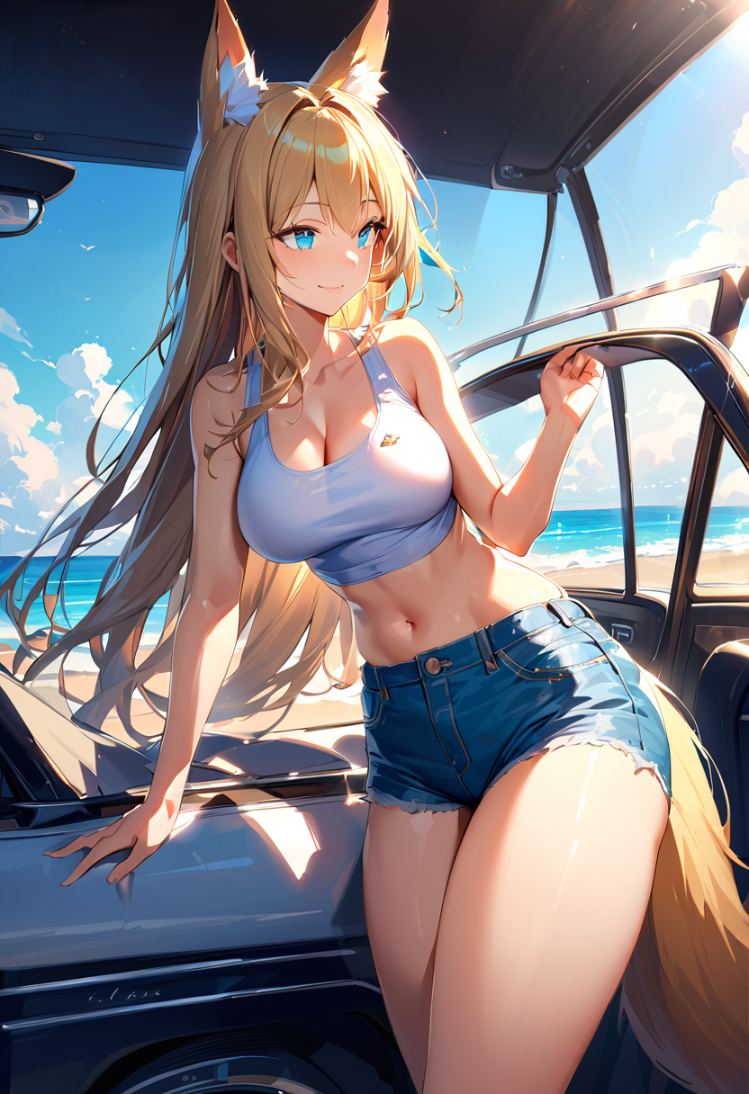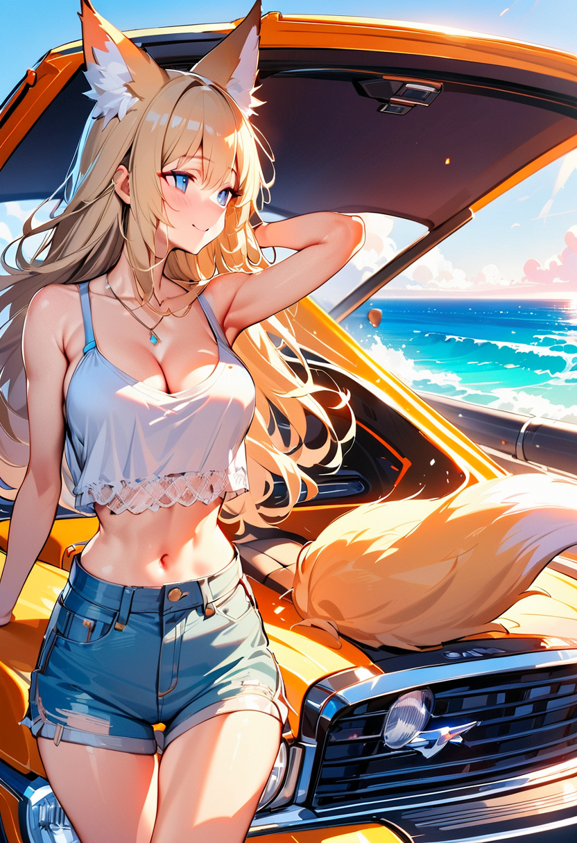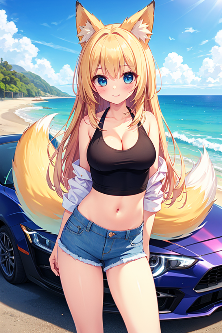 parameters: masterpiece, best quality, masterpiece, masterpiece, best quality, ultra detailed, woman, fox ears, blond, blue eyes, white tank top, no sleeve, short and tight tops, cleavage, midriff-baring, soft midriff, navel, denim hot pants, shiny thighs, cool smile, standing by the seaside with ocean breeze, long hair and fox tail swaying in the wind, peaceful expression, clear blue sky, turquoise sea, sunlight reflecting on waves, convertible car parked nearby, early summer mood, freedom and serenity, fantasy realism, glowing light, coastal road trip vibe