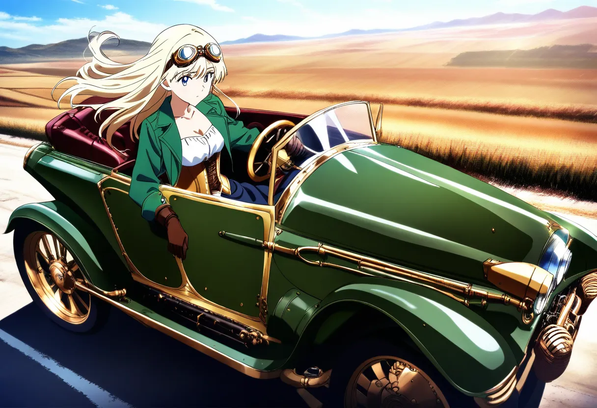 parameters: 1woman, solo, 20yo, medium breasts, corset dress, white blouse, cleavage, (green trench coat:1.2), (gold corset:1.2), leather gloves, beautiful detailed face and eyes, expressionless, (wearing goggles:1.5), blond long hair, shiny hair, floating hair, blue eyes, driving, from side, (steampunk car:1.2), gravel road, country, wide shot, (steampunk:1.3), anime artwork, anime style, key visual, vibrant, studio anime, masterpiece, best quality