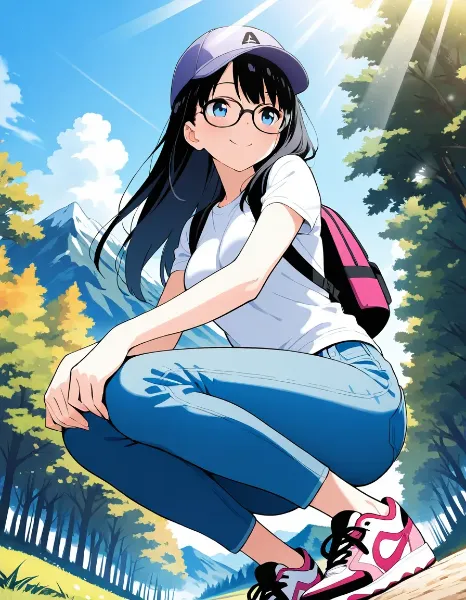 parameters: ((masterpiece)), ((best quality)), (ultra-detailed), ((kawaii)), cute, (lovely), animated style illustration, 1girl, loli, (10yo girl), (pretty little girl:1.4), (beautiful brown eyes), (beautiful light brown hair:1.3), (short hair:1.2), (yellow hairband:1.2), slim, small breast, (Joyous smile:1.3), hiking on a mountain trail, wearing a beige safari hat with a small yellow ribbon, a lavender quick-dry T-shirt with frilly sleeves, beige shorts with floral leggings underneath, and pink hiking shoes, carrying a small pink backpack, The background shows a sunny forest path, Style: soft, cute, natural, cheerful expression, elegant pose, warm color palette, detailed background, cozy atmosphere,, (light rays:1.1).